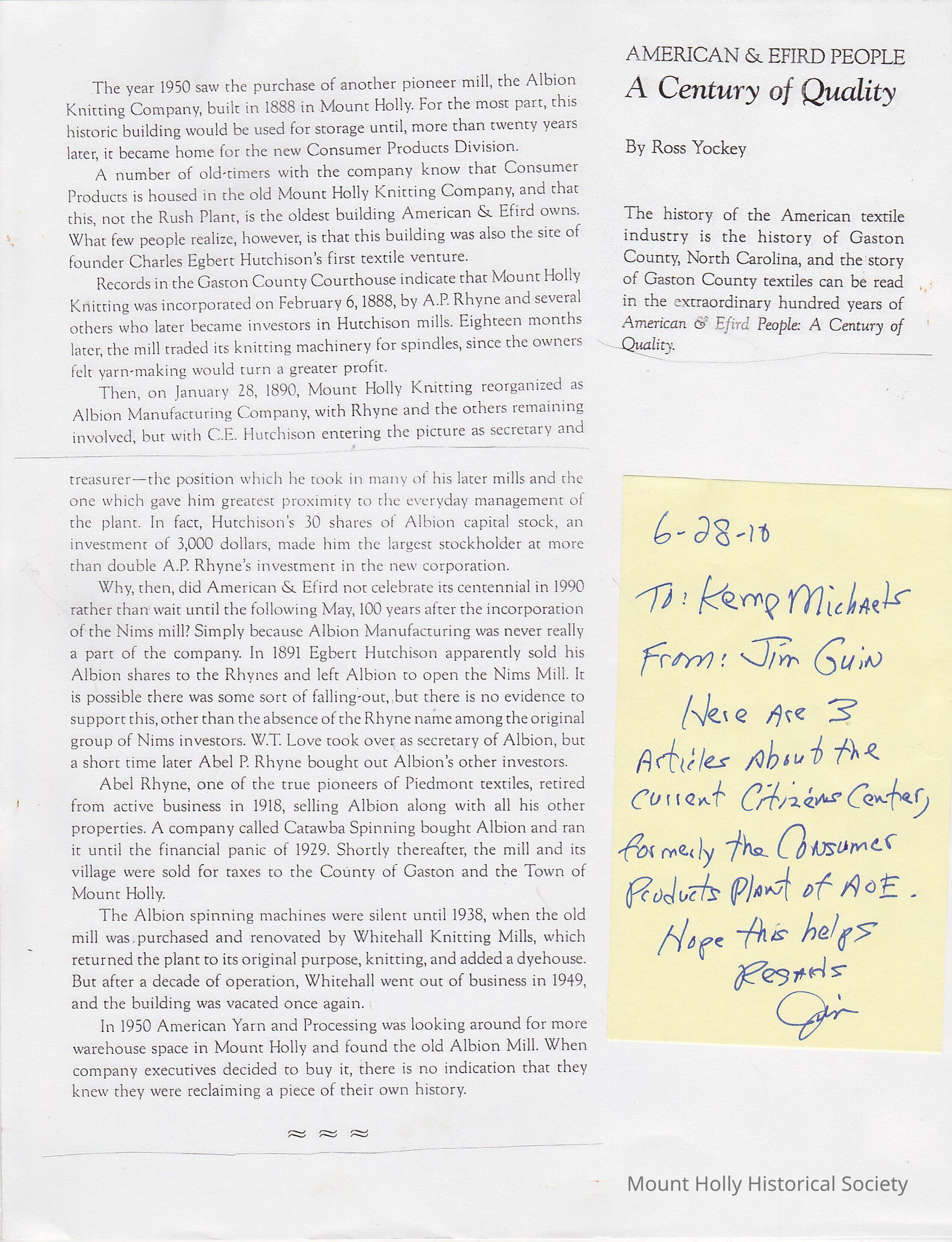 American & Efird Articles about Citizens Center / Municipal Complex / Mount Holly Knitting Company / Albion - from Jim Guin