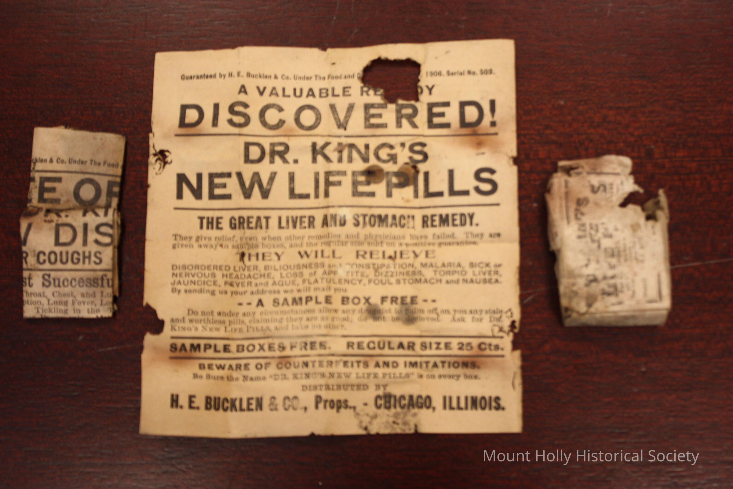 Empty cardboard box with Dr. King's New Life Pills Bucklin and Company Chicago IL Advertising insert and instructions Picture of newspaper advertisement for pills is attached