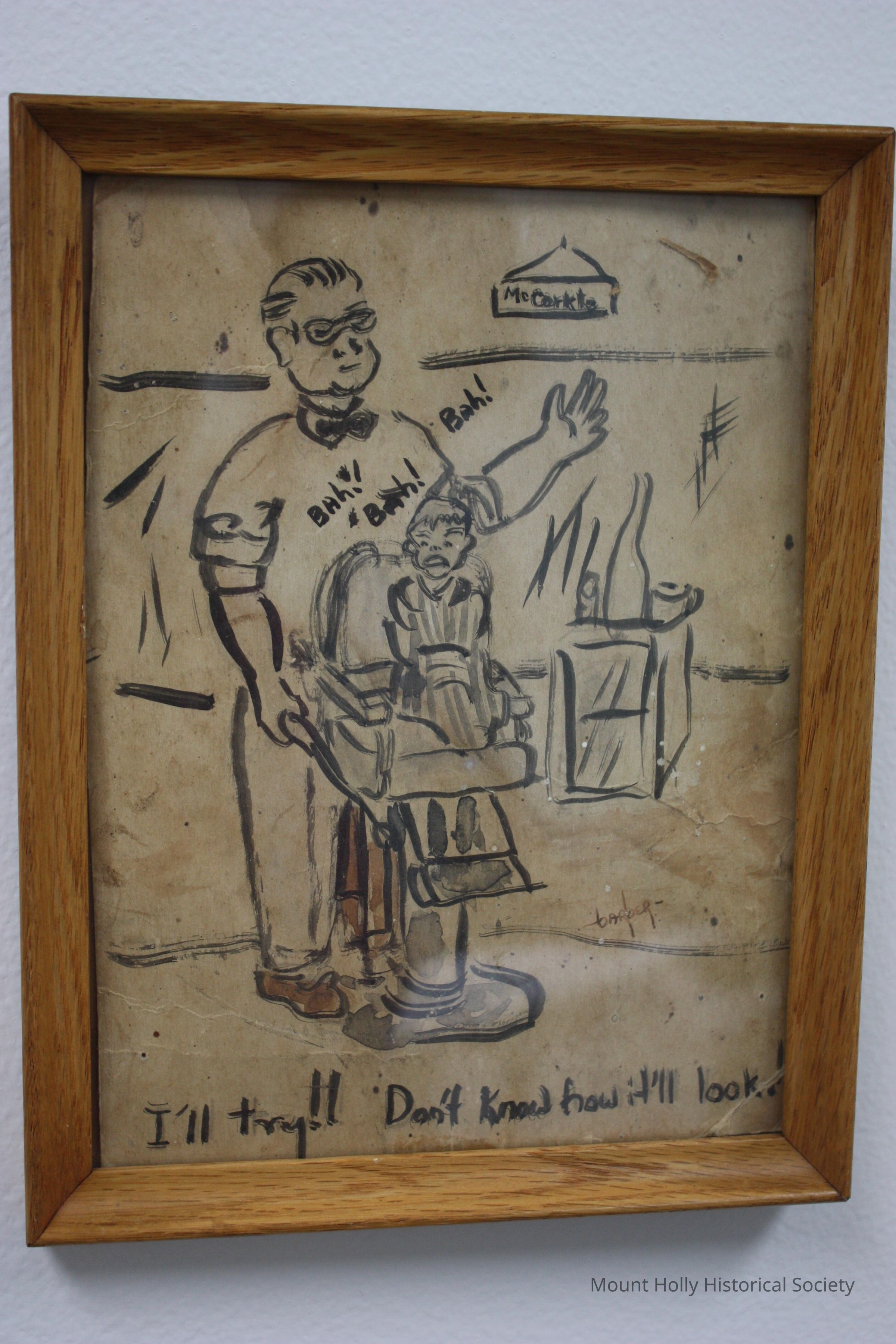 Cartoon, framed, barber shop rendered with the name "McCorkle" on a hanging plaque within the drawing