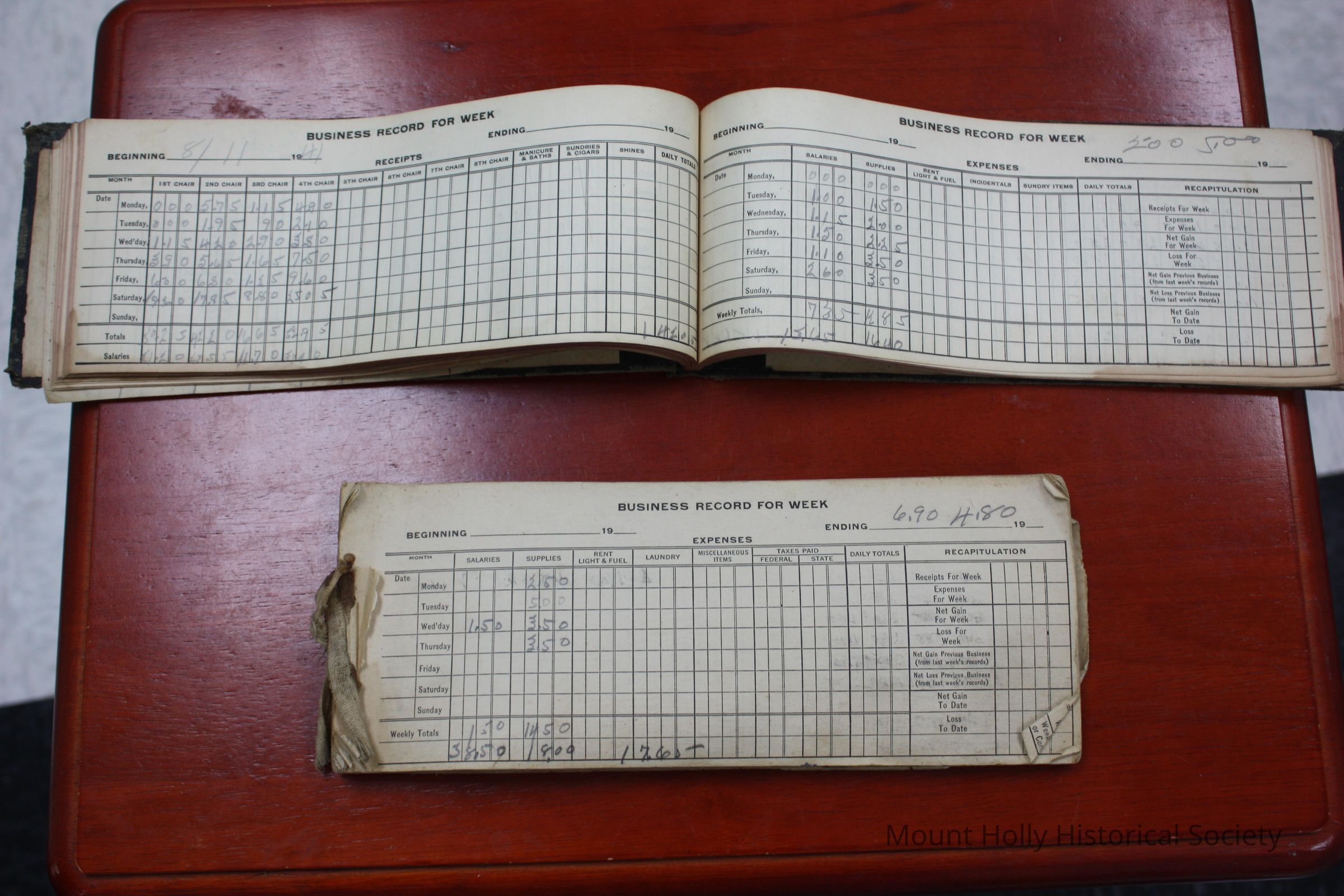 Two ledgers, one missing cover from 1944. One with cardboard cover from 1941. 9 inces by 4 inches