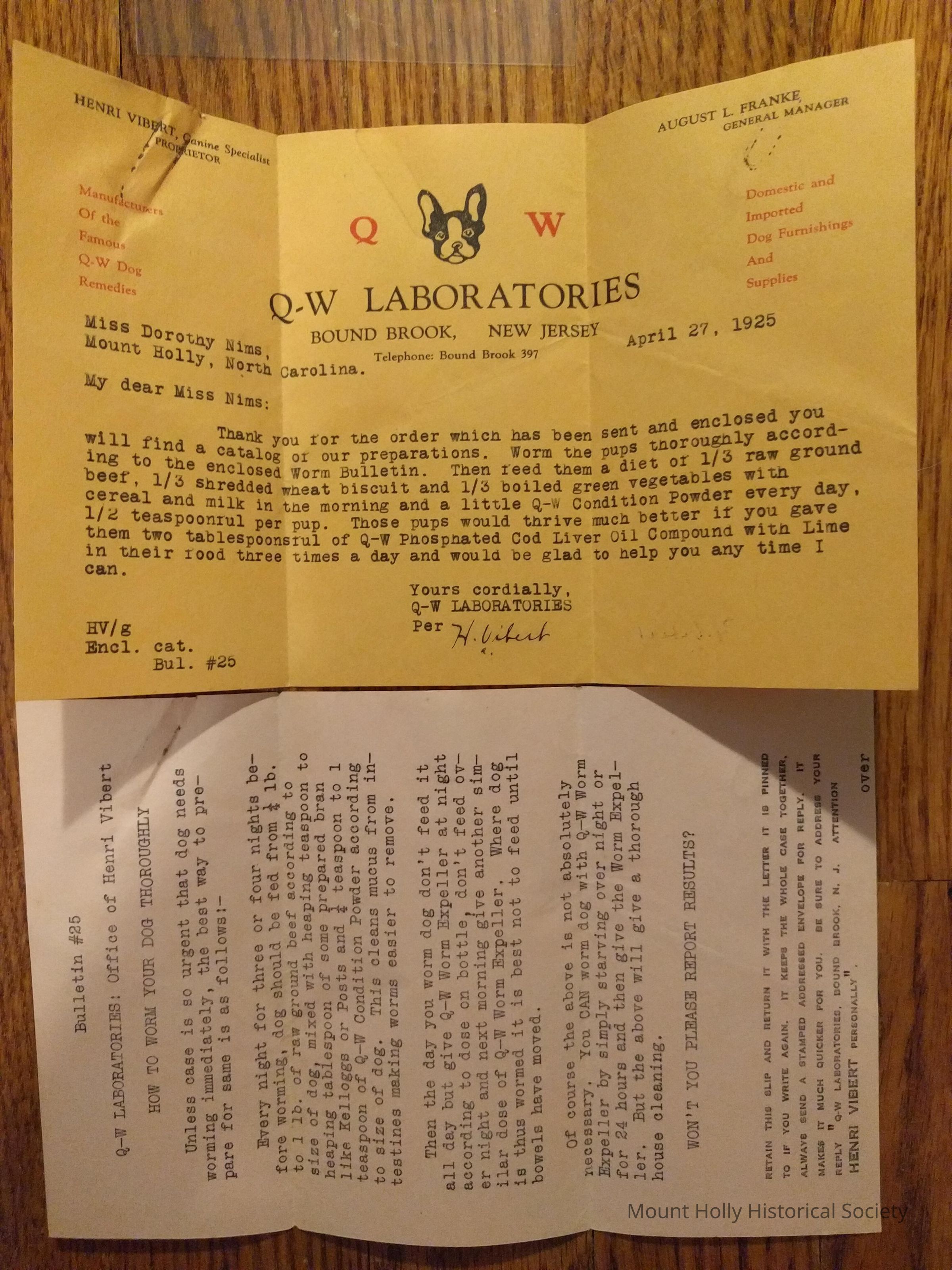 Q-W Laboratorie Letter re: dog worming Dorothy Nims