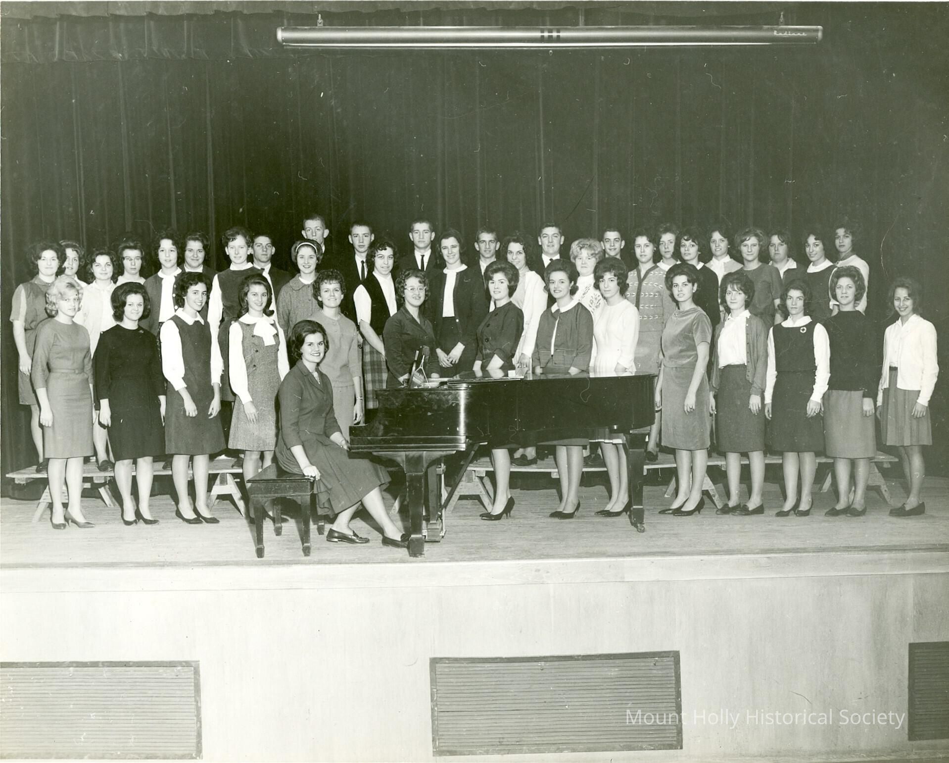 Photo of chorus (mostly women) on stage, with pianist in front of them