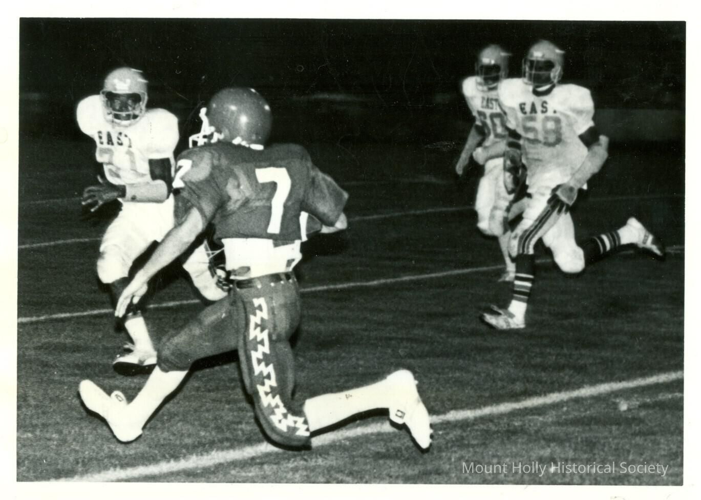 Football player runs with ball while three others chase him during a game at night; from photo's back "Spears dashes / Photo by Scott Griffin"
