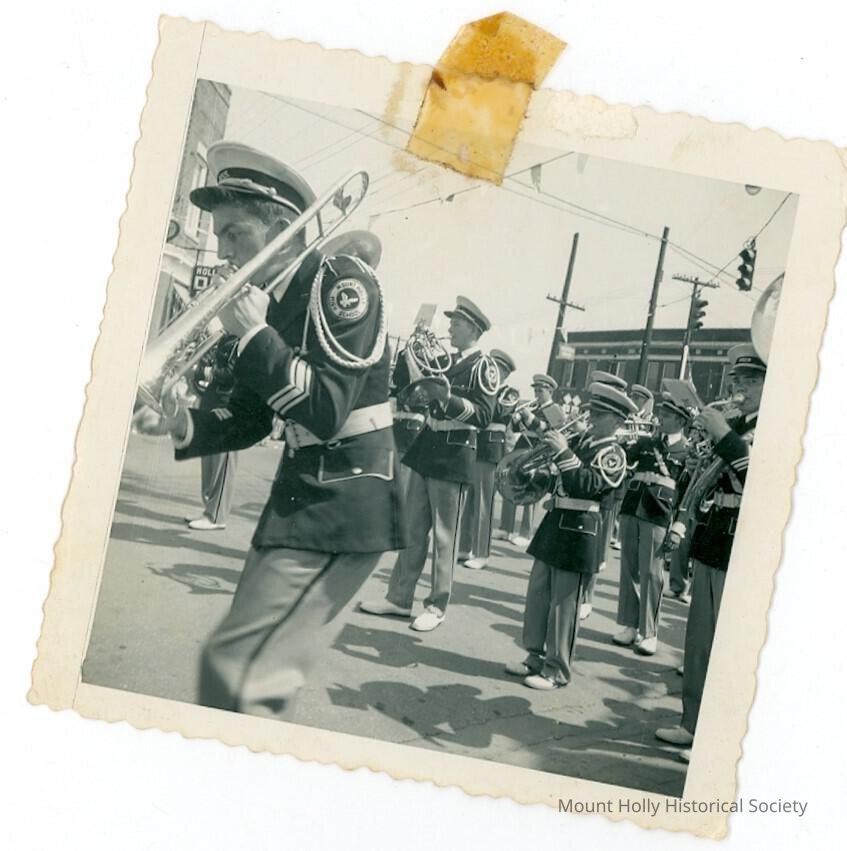 Close-up photo of brass section of Mt. Holly High School marching band, in uniform, marching down street