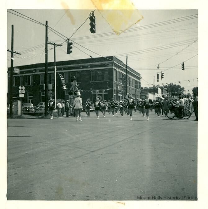 Long-distance view of marching band and majorettes marching down street in uniforms