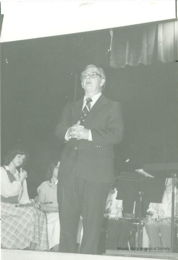 Low-angle black-and-white photo of band director addressing audience from stage of auditorium at Mt. Holly Junior High