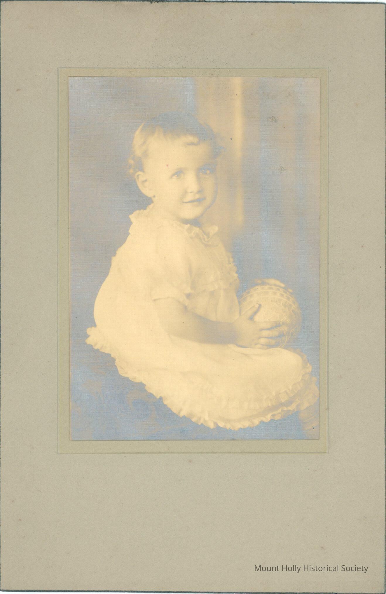 Very young unidentified child, posed and holding ball in its lap