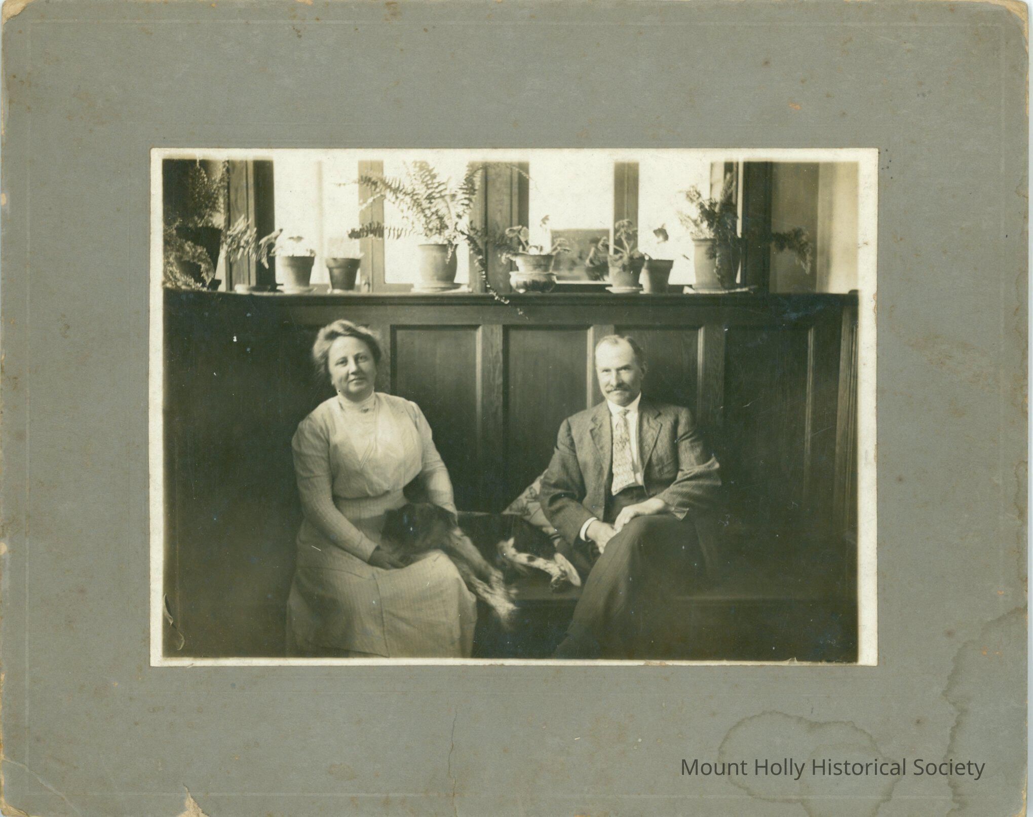Middle-aged man and woman (with dog between them) seated on a wooden bench indoors, with potted plants on the window ledge behind them