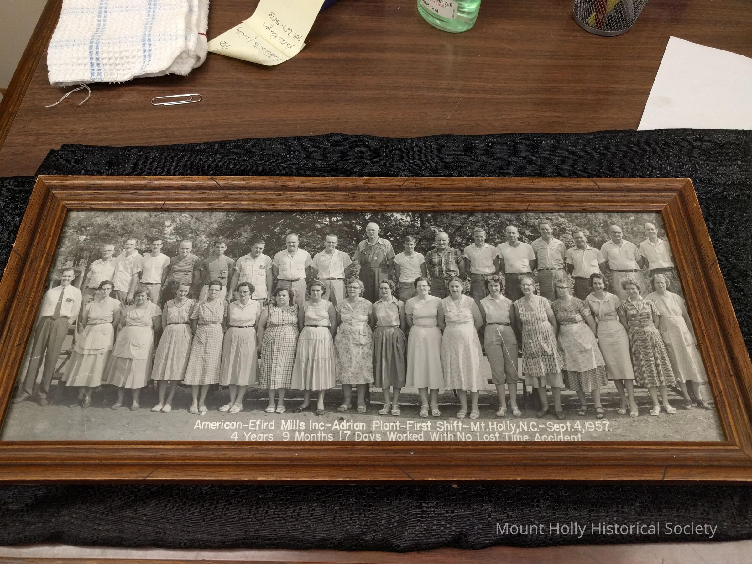 American-Efrid Mills Inc - Adrian Plant - First Shirt - Mount Holly, NC - September 4, 1957 - 4 years 9 months 17 days worked with no lost time accident Framed Men and women, mill workers