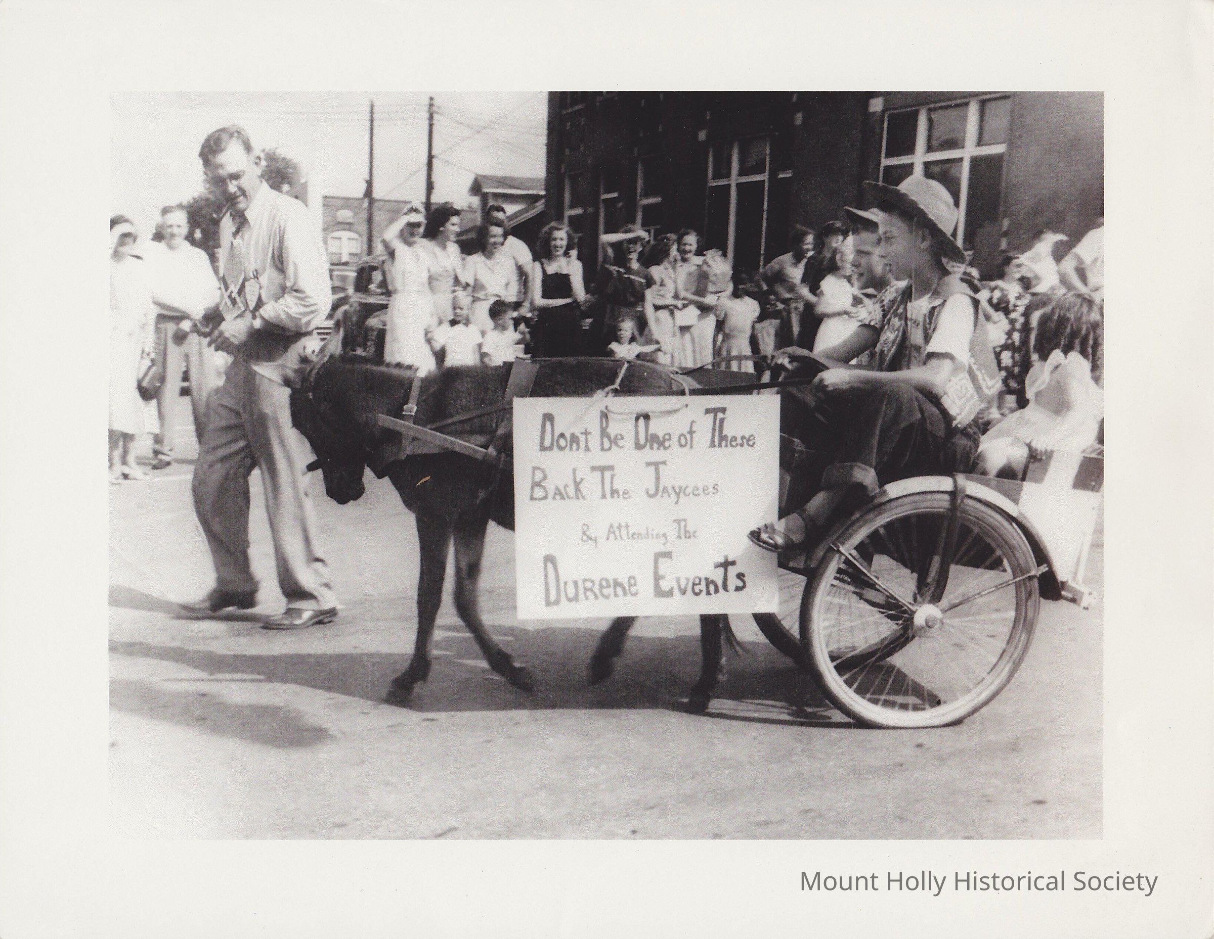 Durene Festival/Textile Festival - "Don't be one of these, back the Jaycees, by attending the, Durene events" Donkey pulling boy in cart, parade, Millican