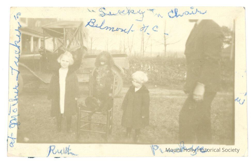 Two young white children standing outside with a black dog sitting on a chair between them; a white man stands to the right; from back "@ Mother Tucker's, Belmont, N.C."