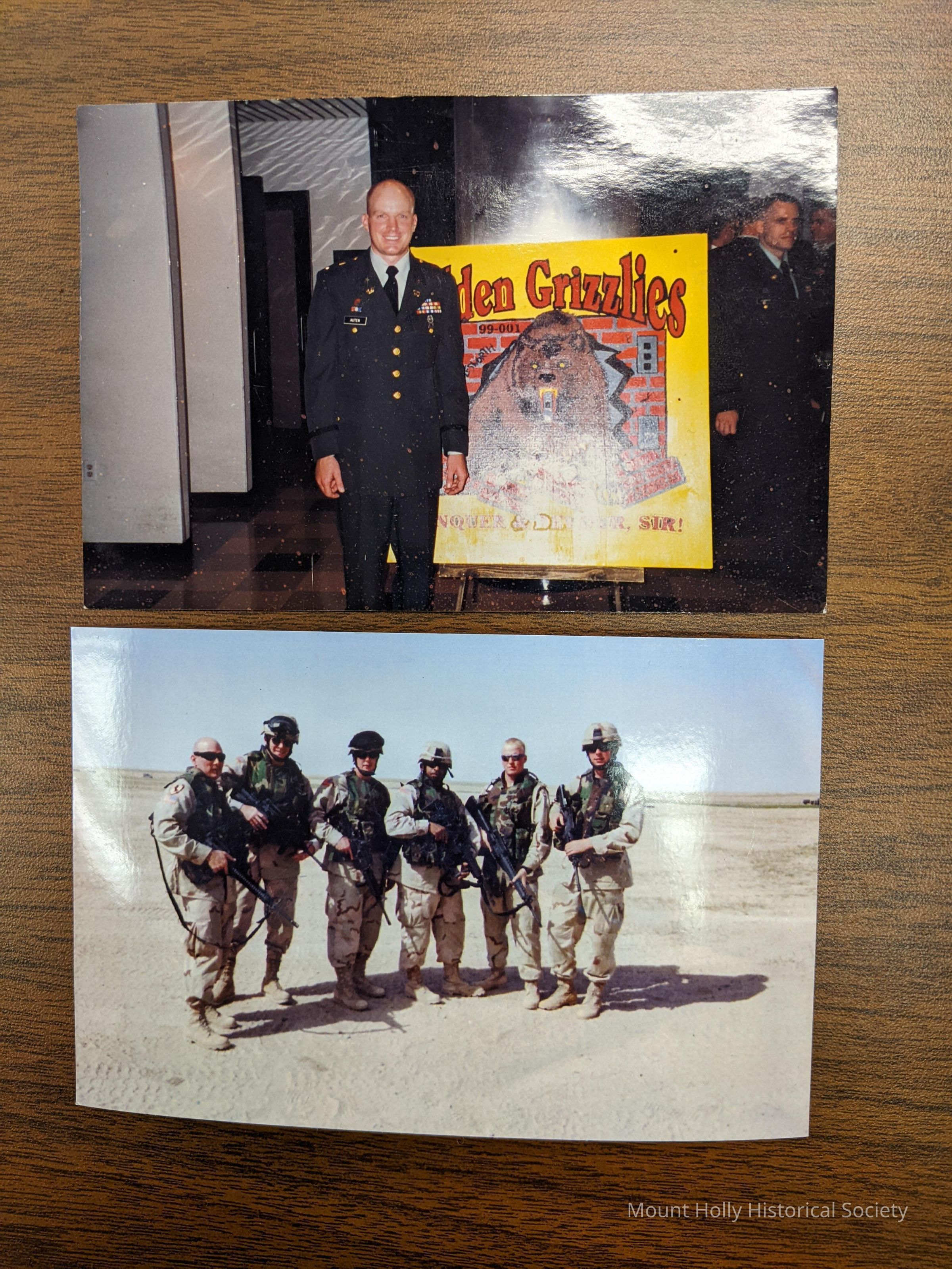 2 photogrphs - Kim Auten in dress uniform (warrant officer academy) and in utility unifrom (NC national guard) with a group of soldiers