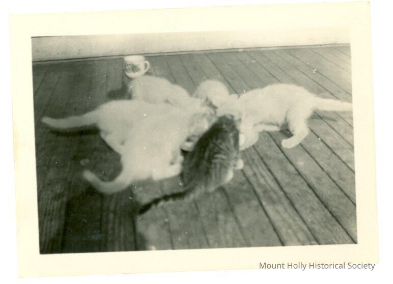 Photo of six kittens (five white, one tabby) feeding from a dish on the floor with a mug in the background