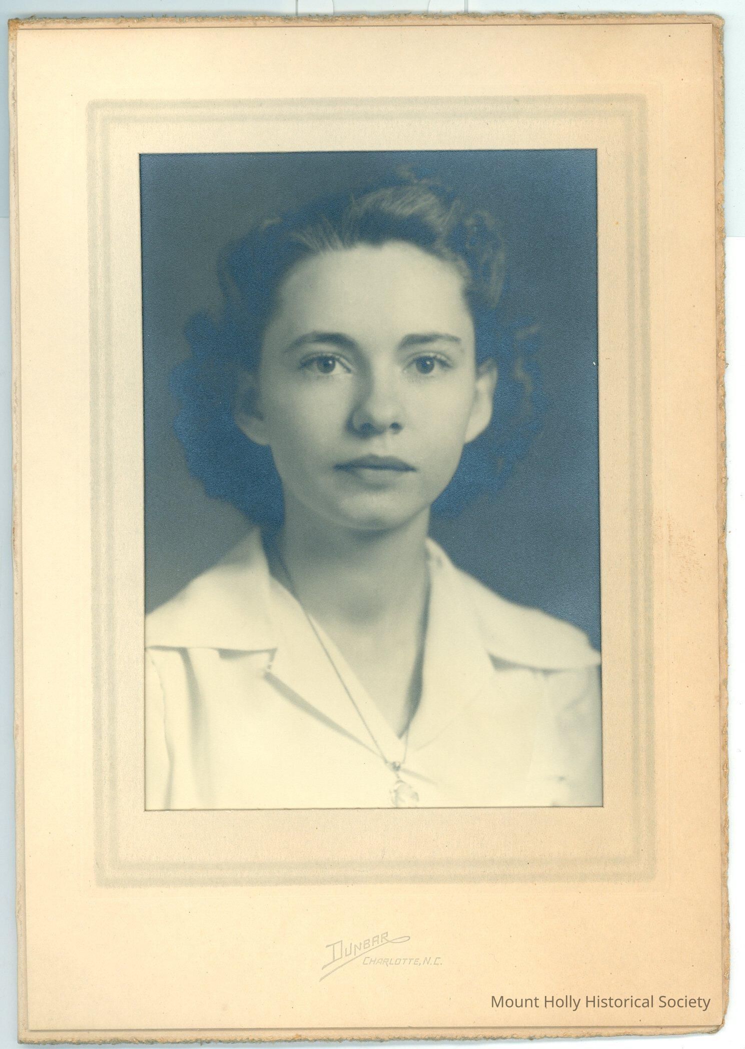 Black-and-white photo of Mae Tucker, from shoulders up, facing camera and wearing a white blouse