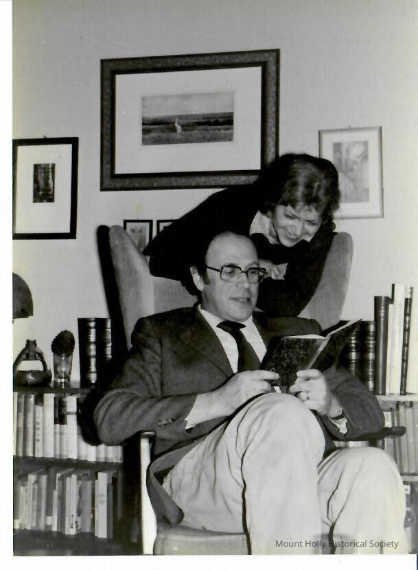 Unidentified seated man with open book and unidentified woman standing behind him and leaning over; illegible writing on back