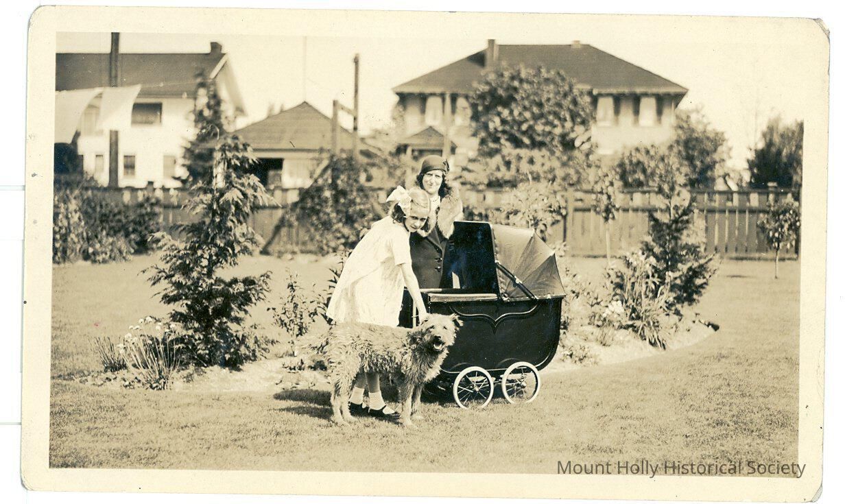 Daunie, Divina, and Florence in garden with Jacqueline in pram