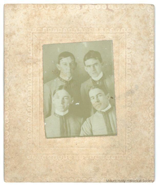 Four young white men in cadet uniforms (?), two seated, two standing behind, all from chest up; from back "Houston Shuford?"