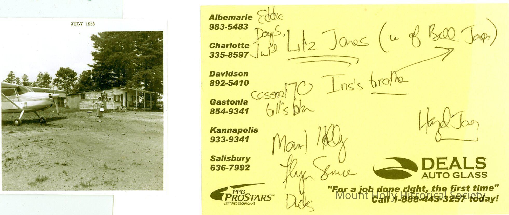 Young white woman gesturing toward a plane parked in dirt yard of an abandoned building, with note accompanying photo