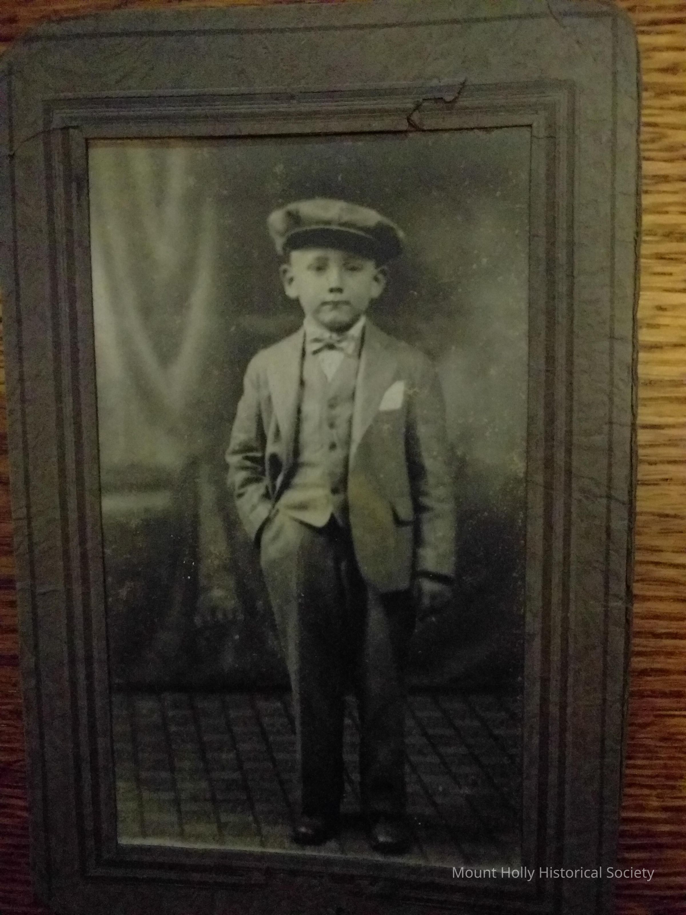 Young boy in suit, picture postcard with paper frame