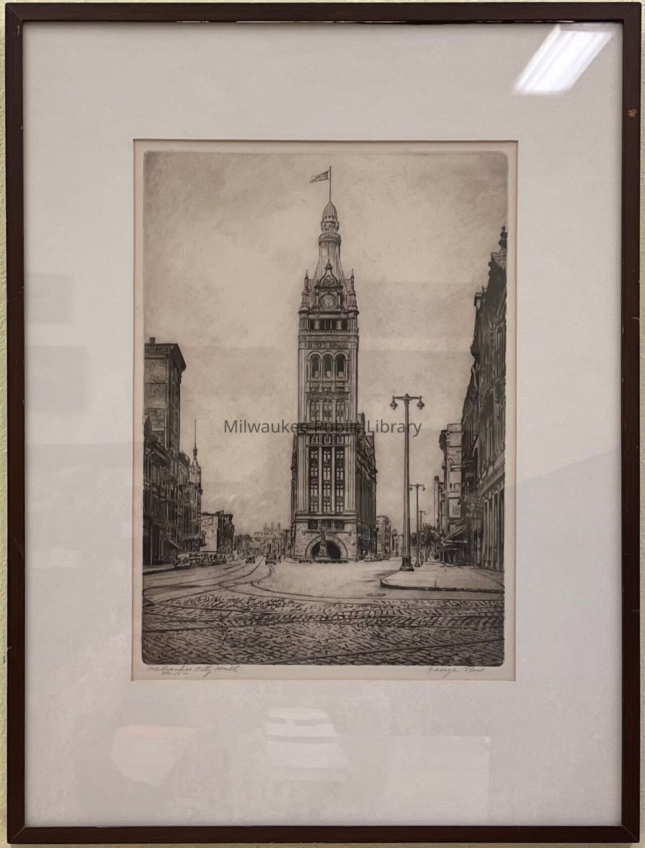 The 12/18/1938 MJ (attached) references an exhibition of "a complete set" of George New's "Milwaukee etchings," including the city hall, St. John's cathedral, the library-museum building, St. James' church, St. Paul's, Merrill Hall at UWM, Marquette towers, and the high altar at Gesu, at the Central Library. The etchings were shown alongside "the artist's plates and tools."