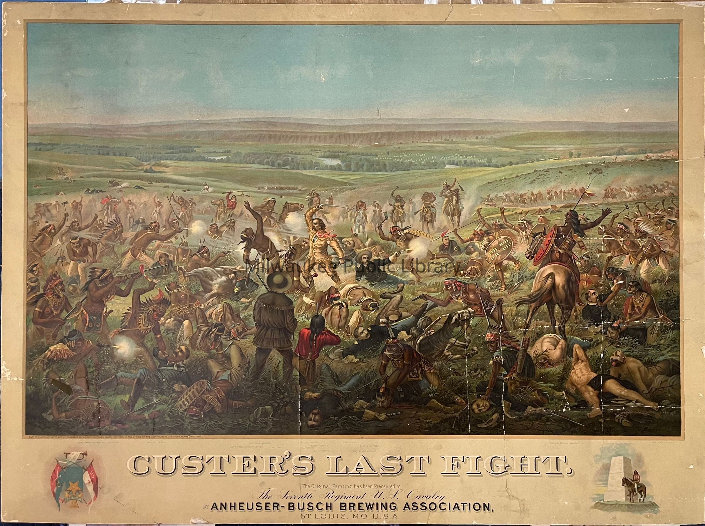 Based on photographs of the Adams original, the Becker version is more topographically correct but also more graphically explicit as an interpretation of the very violent event. The color print depicts the battle between General Custer's troops and Indian warriors at Little Big Horn. Custer is featured at center waving a saber and dressed in a fringed buckskin. The remaining cavalry officers, except for Custer's brother Tom, are dressed in military uniform. Indians are armed with scalping knives, tomahawks, clubs, spears, and rifles. The dead appear in foreground, with several identified in the bottom margin. The background depicts a peaceful landscape, though there is a hint of the thousands of Indians that significantly outnumbered Custer and his men. Custer's medals and banners are depicted in lower left margin. In the lower right margin is an image of a Native American on horseback posing beside the granite monument for the 7th US Cavalry that was erected in 1881 at the Little Bighorn Battlefield. Text below the image advertises the Anheuser-Busch Brewing Assn.
