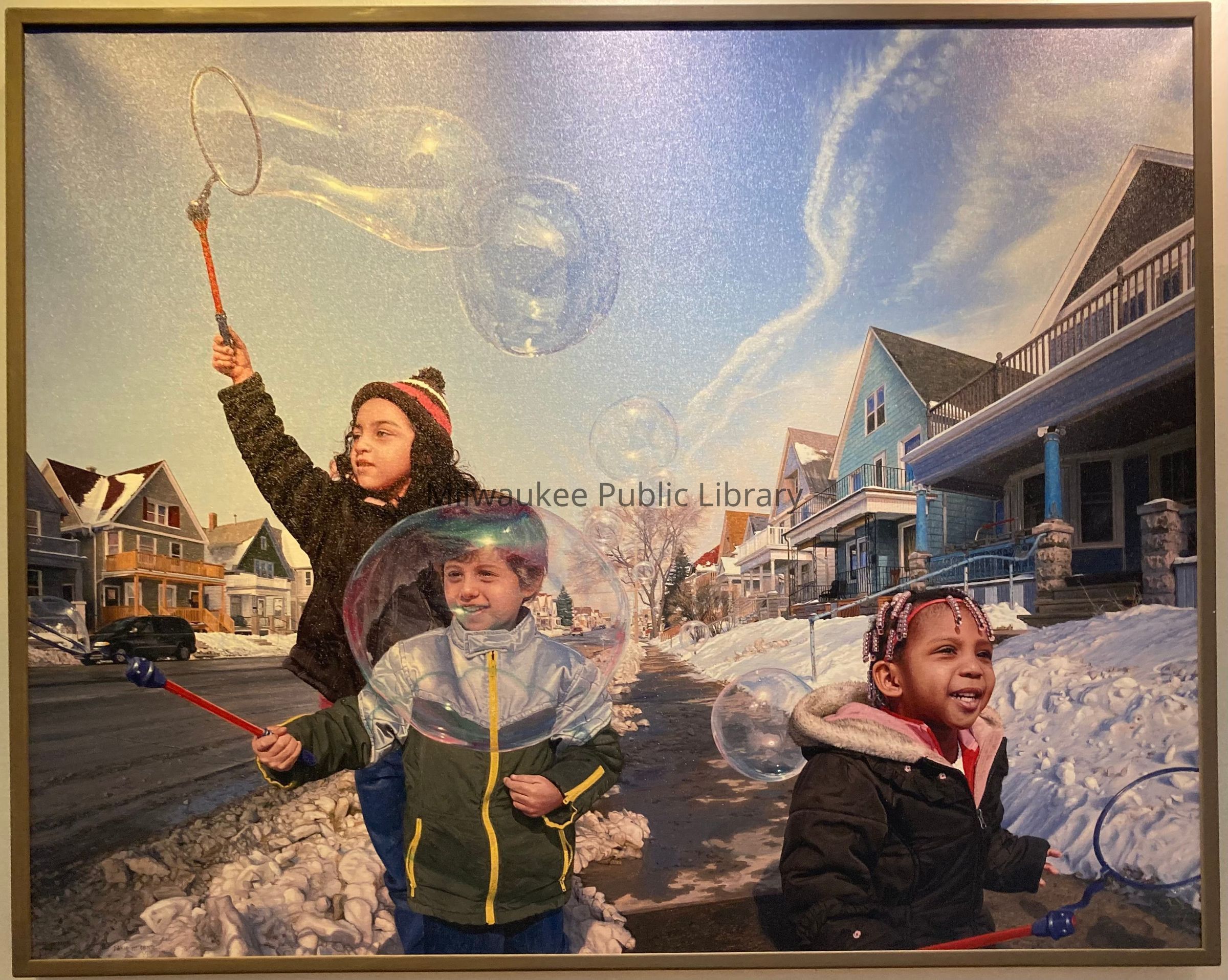 According to the artist, "'Wishes in the Wind'” is a portrait of three exuberant Milwaukee children who have been challenged by adversity, and represent the voice of all children hoping for a brighter future.'"