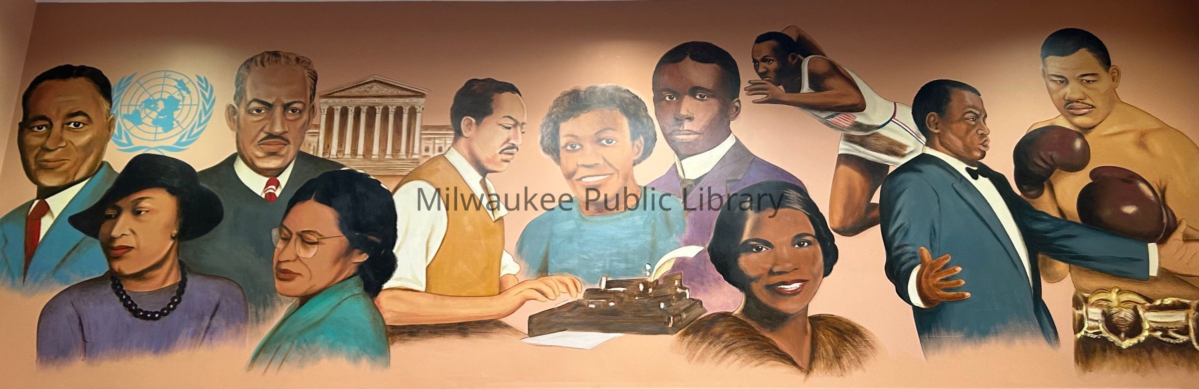Part three of a three-part mural showing famous persons of African and African American heritage.
