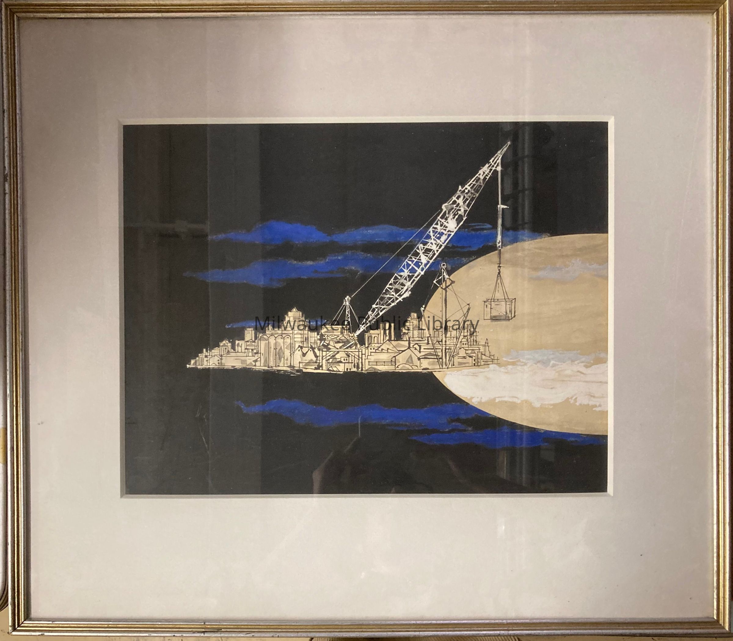 No visible signature/date/inscription/marks, unless obscured by mat. Verso behind frame backing has been examined and there is no title, date, or artist visible on the back of the illustration board.