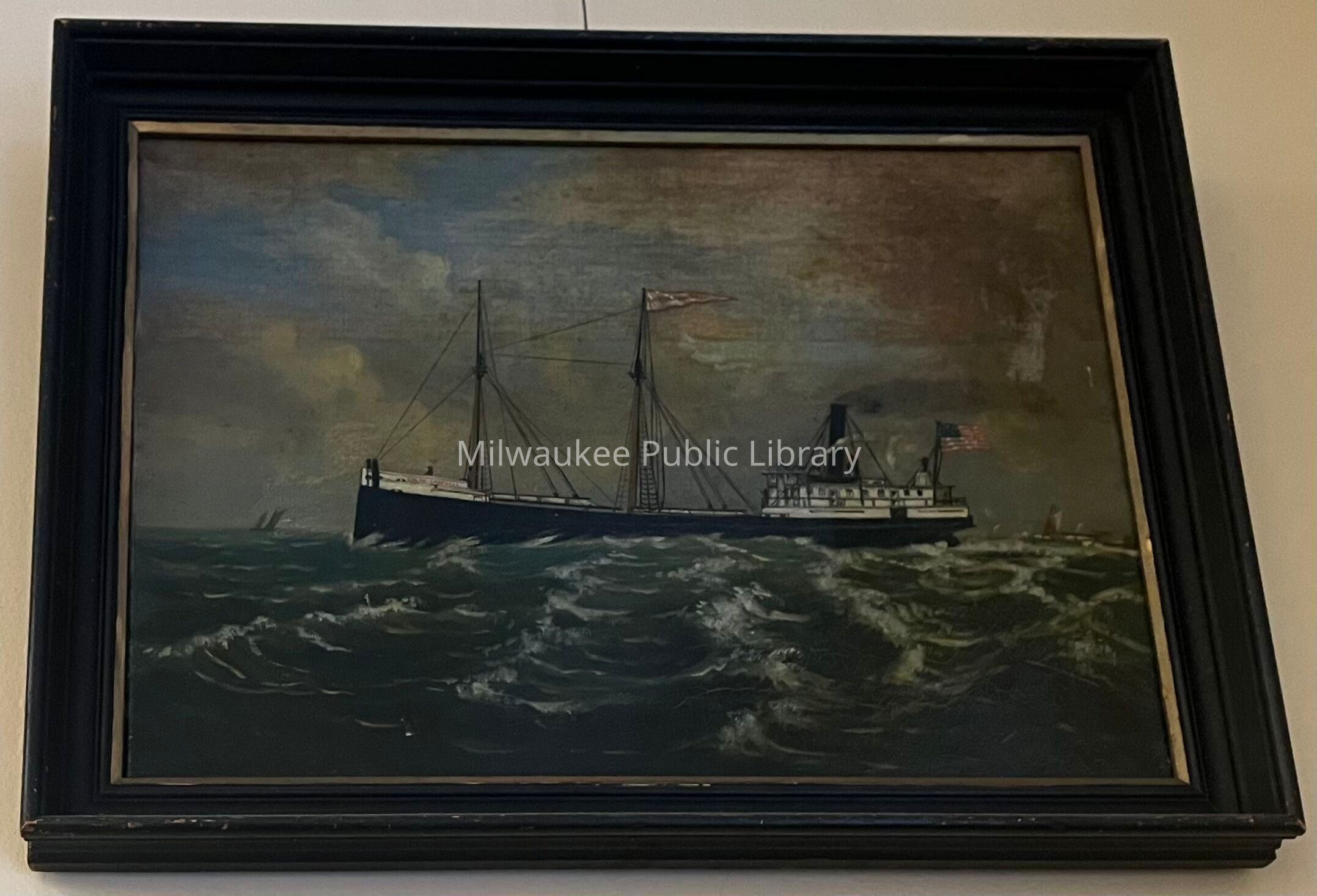 Wood, Lumber Steam Barge “two masts, one stack”. Built 1869 Gibraltar, Michigan, capacity 500,000 board feet of lumber. Milwaukee based 1876-1899. Renamed EMBURY in 1900, burned and beached 1903 Grand Island, Niagara River, New York.Collection
