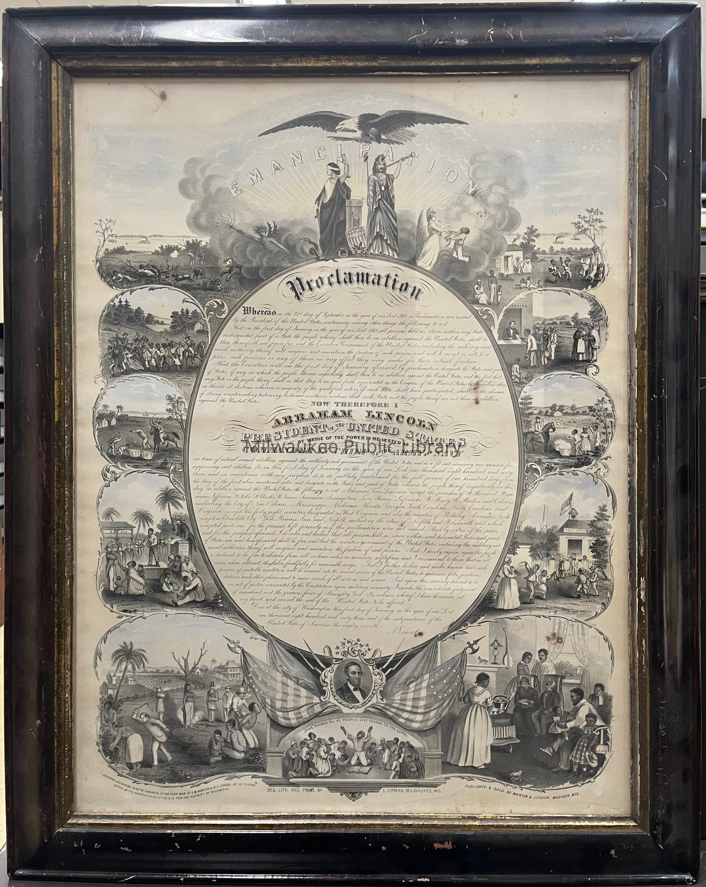Abraham Lincoln's Emancipation Proclamation. Eagle and Lady Justice and Columbia at upper center, followed by the devil and angel and images of slavery (with the devil on left) and emancipation (with angel on right), text of the Emancipation Proclamation, portrait of Lincoln, and "Give Thanks All Ye People, Give Thanks to the Lord."Collection