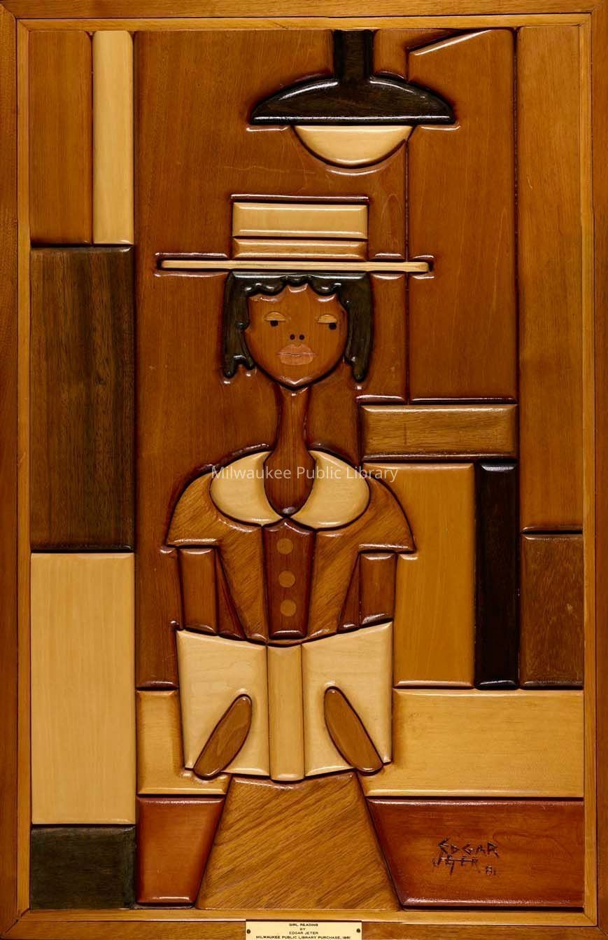 Edgar Jeter (1934-1987) was an innovative and prolific self-taught artist of many media, as well as a self-taught musician and jazz lover. Jeter was known for his “wooden puzzle” portraits, of which "Girl Reading" is an exemplar. As a profile of the artist included in the companion digital collection explains, “[t]hey are portraits in wood, but they have more dimension than … paintings." Jeter's creative experimentation with new media typified the work of the King Library Freewheelers. “Girl Reading” is constructed of ebony sourced from Africa, locally-sourced mahogany, and teak.