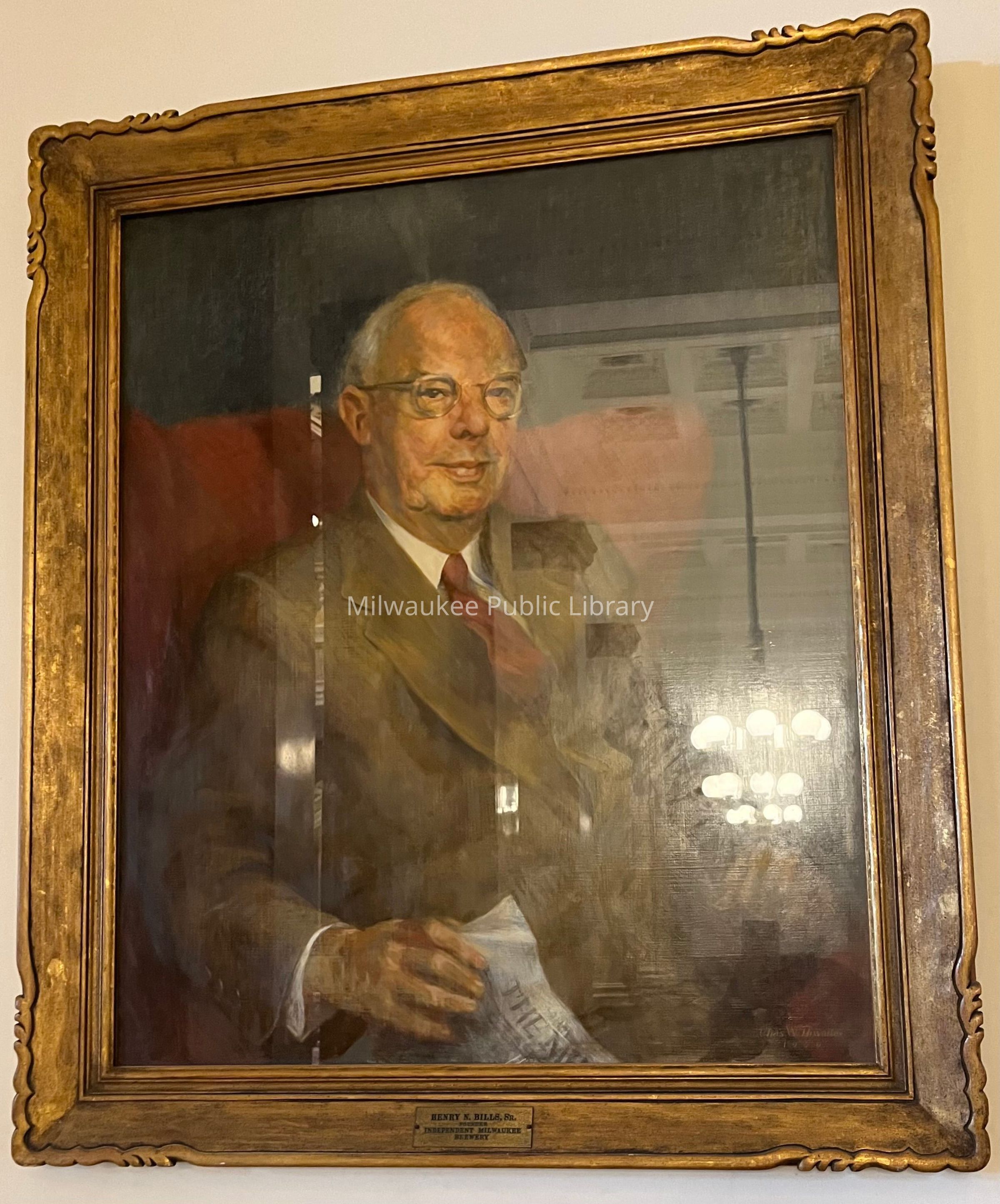 "Octogenarian Henry N. Bills Sr., who wouldn't think of relinquishing his honorary title as oldest active brewery executive in Milwaukee, received this huge oil portrait of himself as a surprise at the annual Christmas party of his Independent Milwaukee Brewery sales staff Friday night. The party at the Wisconsin Club also was in honor of Independent's 50th year of operation. President Bills (holding the picture) is flanked by his executive family (from left) Harry E. Bills, executive vice president and general manager; Fred K. Eisner, secretary and general sales manager; H. Newman Bills, vice president, production." (MS, 12/9/1950).