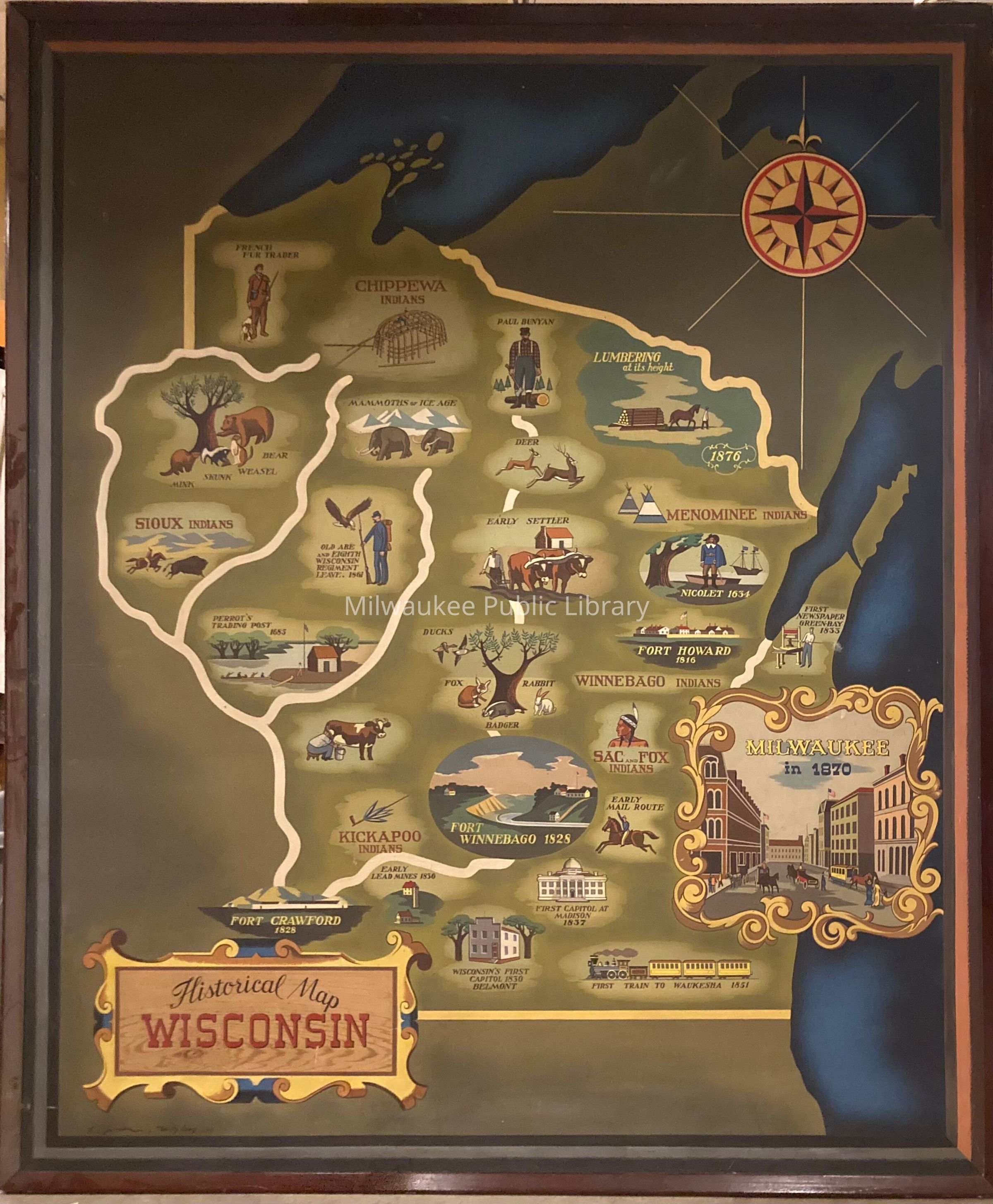 Illustrated map depicts local tribes, white settlement, and various 'firsts' in Wisconsin history. From top left corner proceeding from left to right and down, vignettes include: "French Fur Trader"; "Chippewa Indians" [sic]; "Paul Bunyan"; "Lumbering at its height" (1876); mink, skunk, weasel, and bear around a tree; "Mammoths of Ice Age"; "Deer"; "Menominee Indians"; "Sioux Indians" [sic]; "Old Abe and Eighth Wisconsin Regiment Leave. 1861"; "Early Settler"; "Nicolet 1634"; "Perrot's Trading Post 1685"; ducks, fox, badger, and rabbit around a tree; "Winnebago Indians"; "Fort Howard 1816"; "First Newspaper Green Bay 1833"; man milking cow; "Sac and Fox Indians"; "Kickapoo Indians"; "Fort Winnebago 1828"; "Early Mail Route"; "Milwaukee in 1870; "Fort Crawford 1828"; "Early Lead Mines 1836"; "First Capitol at Madison 1837"; Wisconsin's First Capitol 1830 Belmont"; "First Train to Waukesha 1851."