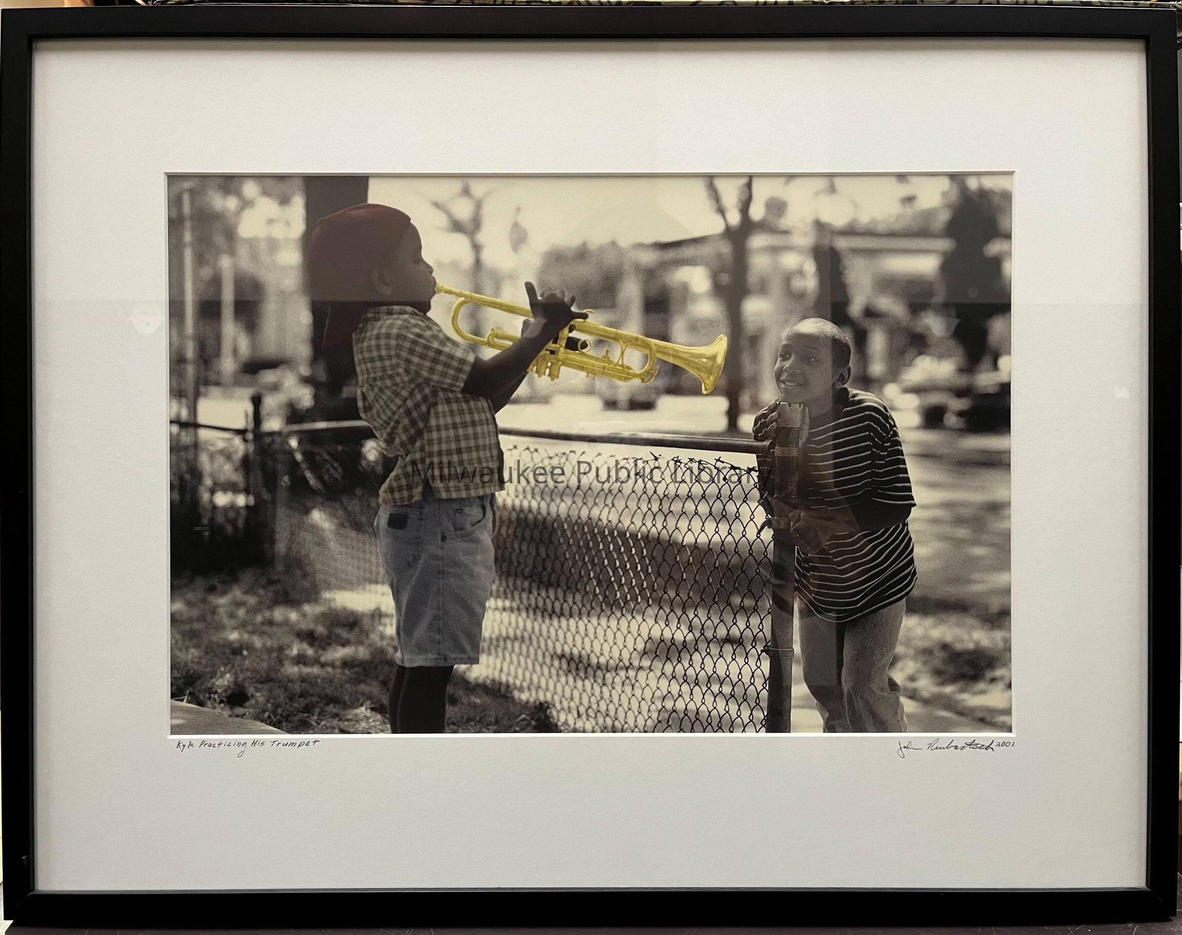 An extended title is also supplied on the back of the frame: "Kyle practicing his trumpet with Marcus looking on."