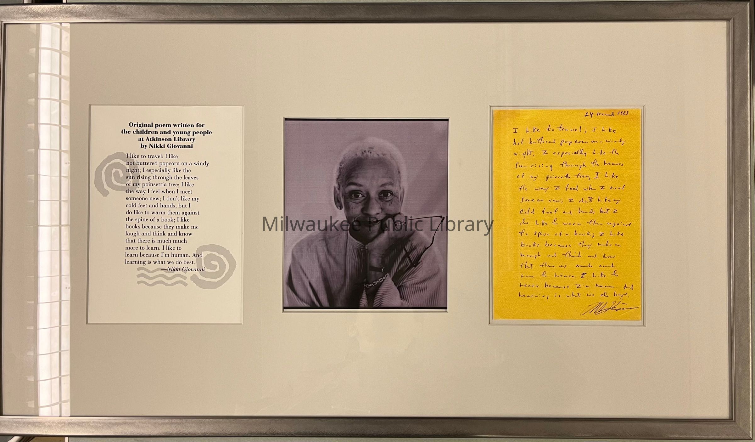 The work features a facsimile of an original, handwritten poem composed by Nikki Giovanni "for the children and young people at Atkinson Library"; the original poem is in the Milwaukee Public Library Archival Collection, Milwaukee Public Library Archives & Special Collections.