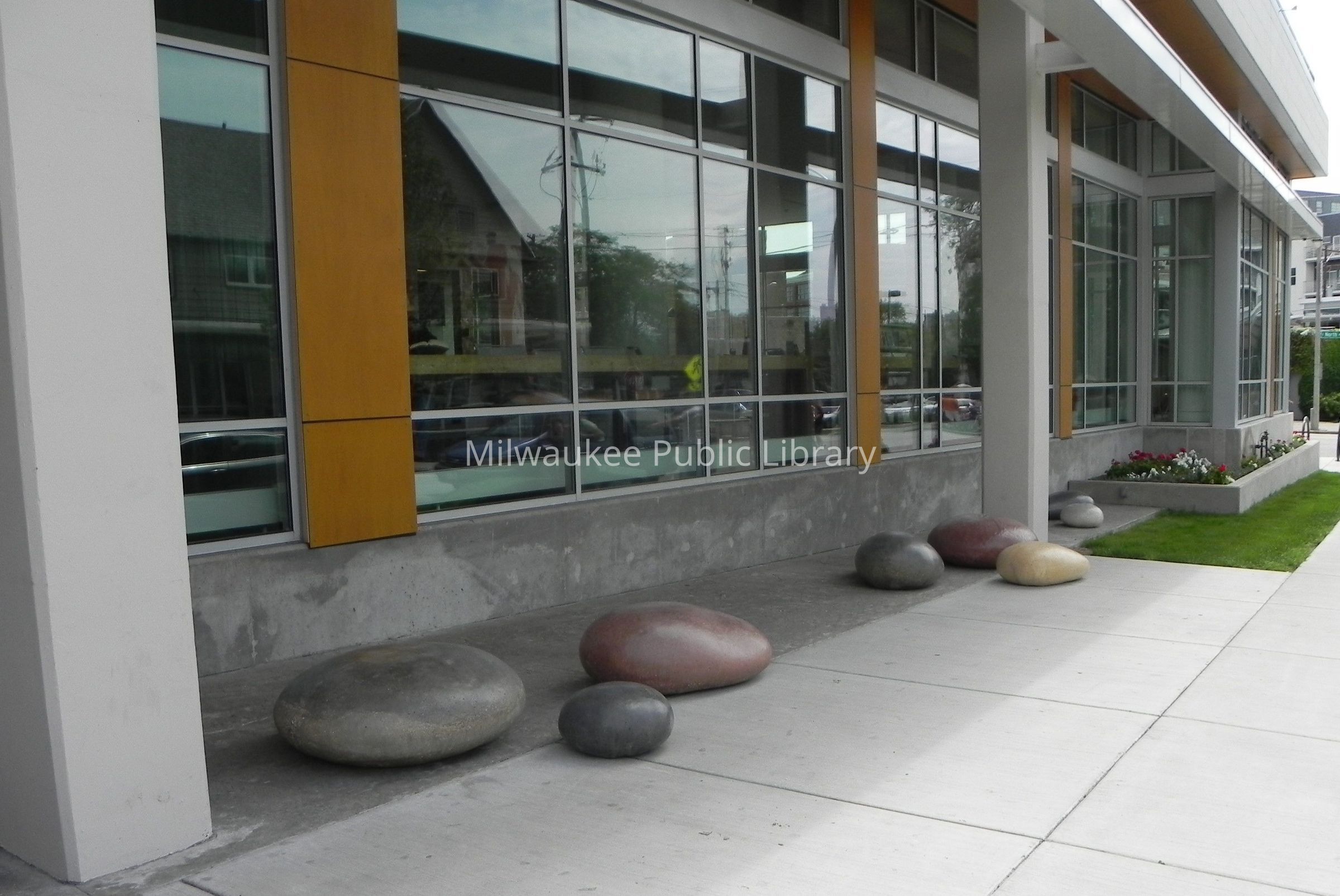 From public art collection description on East Branch webpage: "The Pebble-forms mark the entrance of the library with a series of smooth, biomorphic sculptural forms. Taking material cues from the site’s concrete ground plane and formal cues from stones found on the shores of nearby Lake Michigan, the Pebble-forms add a contrast of soft curved surfaces to the largely rectilinear building design. Like the ‘Serpent’ and ‘Rack’ nearby, the Pebble-forms similarly serve a dual purpose of sculptural and functional design, as they are designed to be used as outdoor seating for library visitors.”Collection