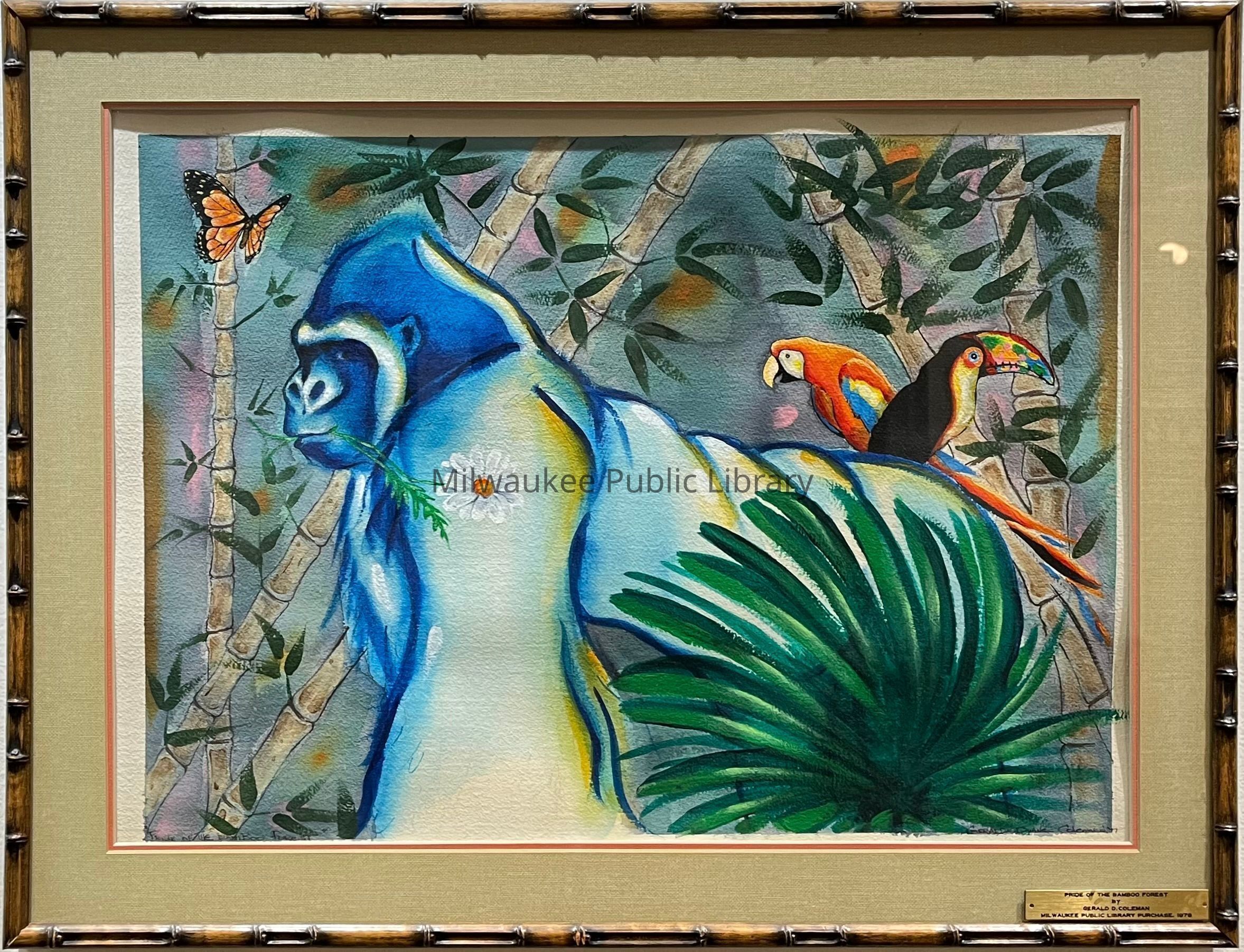 As Coleman explained, his blue gorillas were “based on those familiar luminaries of the Milwaukee County Zoo,” where he “spen[t] several hours each week …, studying and sketching Samson and Tanga.” Contrary to common misconceptions about the “hulking but gentle and intelligent” gorilla, Coleman admired his subject as “a shy, unaggressive vegetarian who cherishes his family and fights only when threatened,” and commented that “the world would be better off … [i]f man would take on more of [the gorilla’s] attributes.” Thus, the viewer finds Coleman’s blue gorillas “doing the most delicately civilized actions—eating berries, picking daisies, playing with butterflies.”
