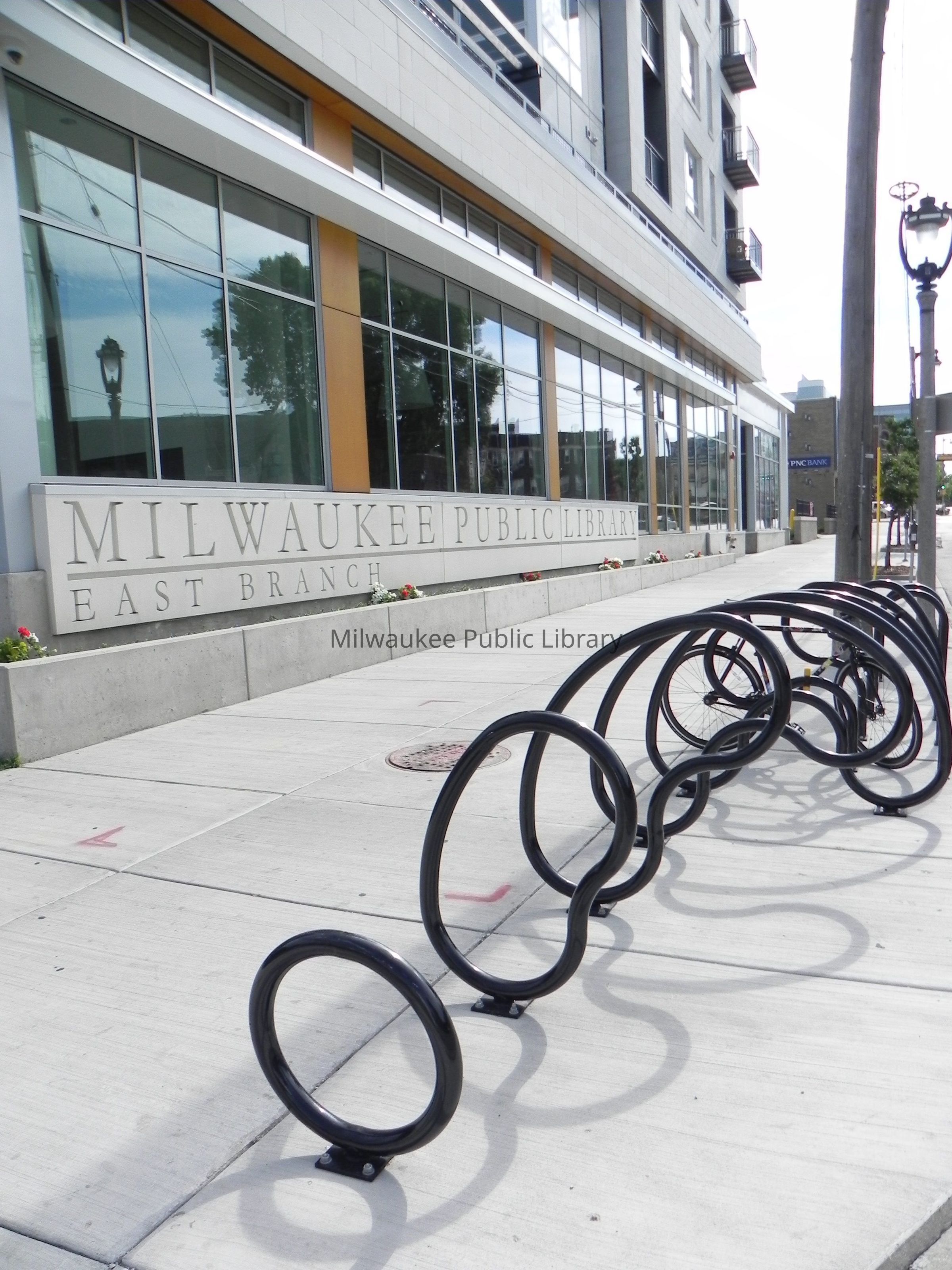 "This sculpture begins as a typical row of steel bike racks, which successively leap and transform into a perfect circle. While presenting itself as sculpture, the piece is completely functional as a bicycle rack." [From East Library brochure issued by MPL]Collection