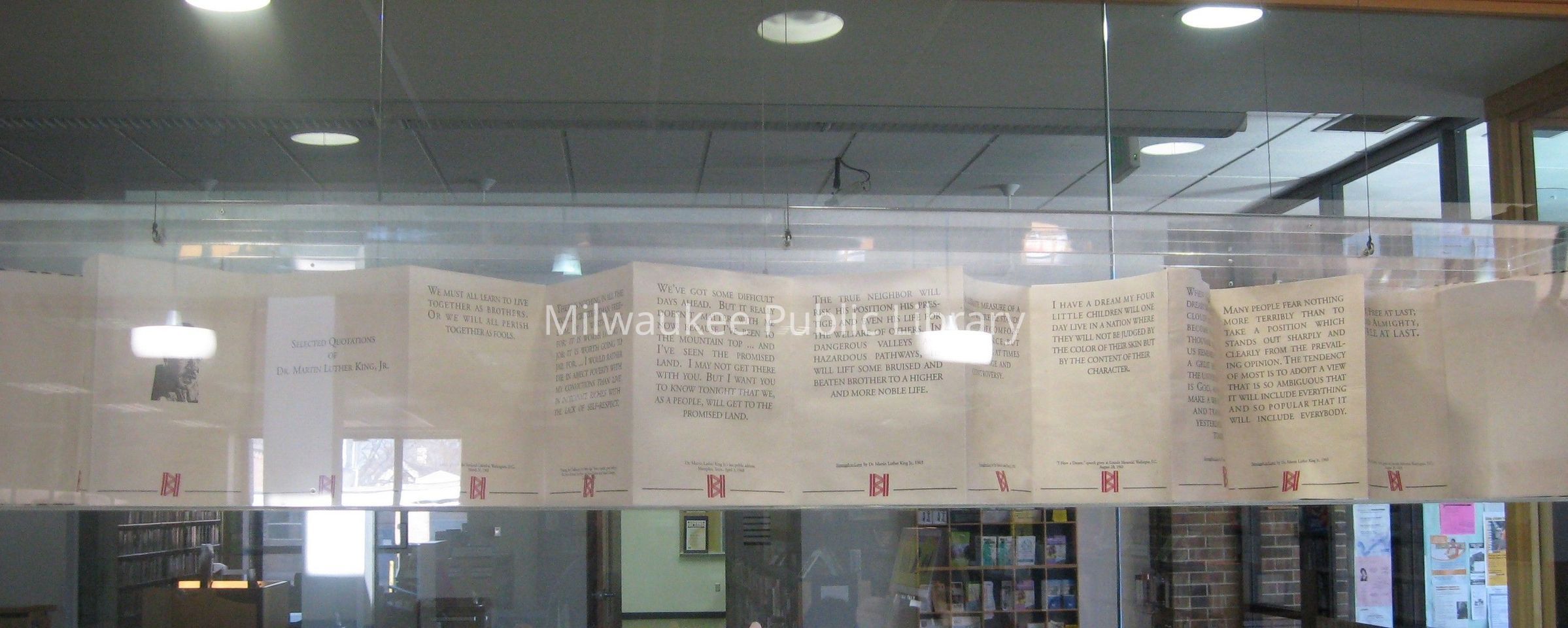 "Kennedy published a limited edition of 34 copies of the Martin Luther King memorial book in addition to the first copy which is on display at King Library. Seventeen copies were presented to the Milwaukee Public Library for the Central Library and neighborhood library collections. The remaining 17 were presented to the public and private schools in the community served by the Martin Luther King Library."Collection