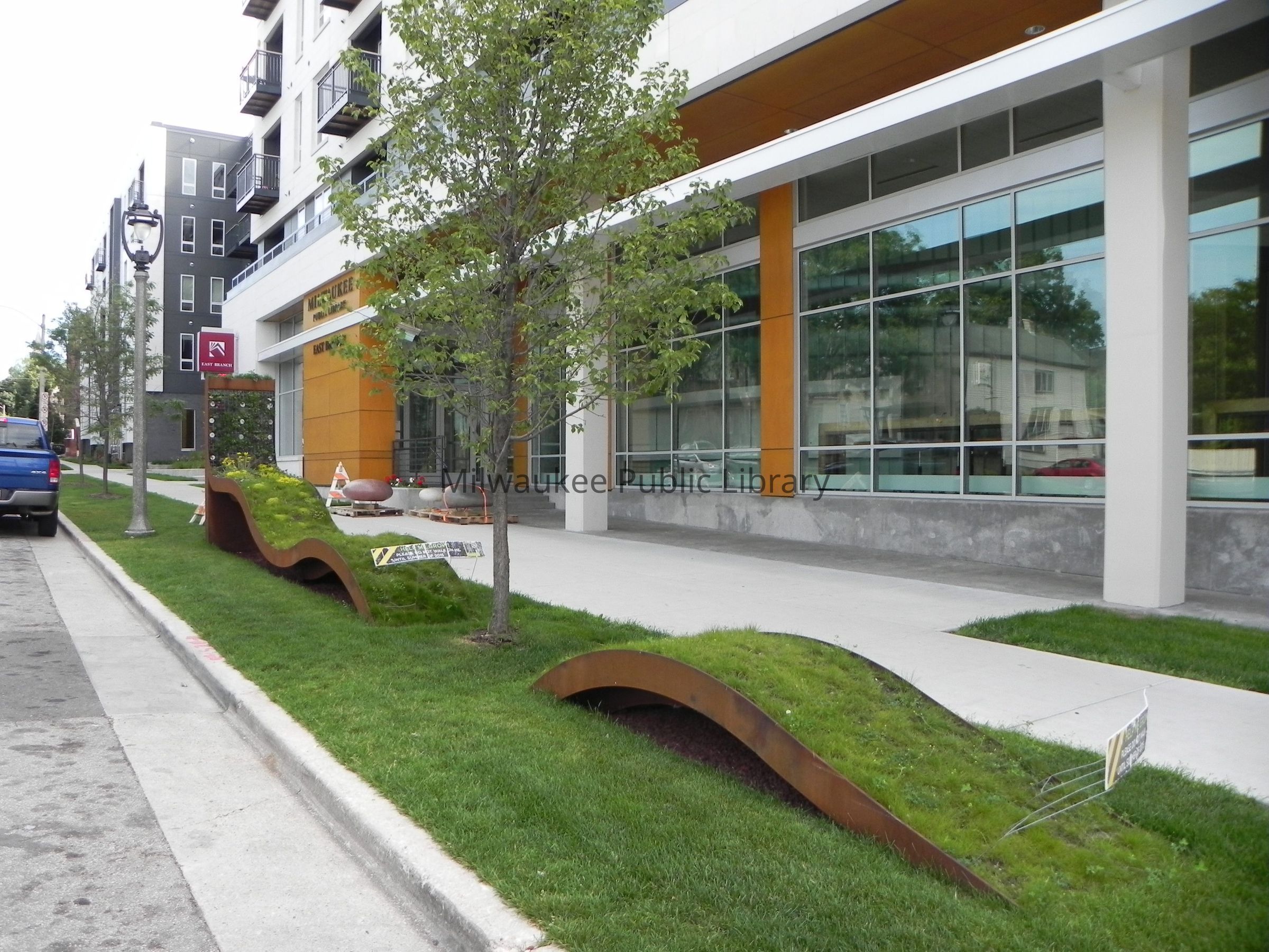 "The Serpent is a living, growing sculpture. Made from Corten steel and planted with grass and a variety of sedums, it emerges from the ground like a magical green ribbon. As the sculpture undulates over and through the ground, the grass gives way to a planted living wall." [From a East library brochure issued by MPL]Collection