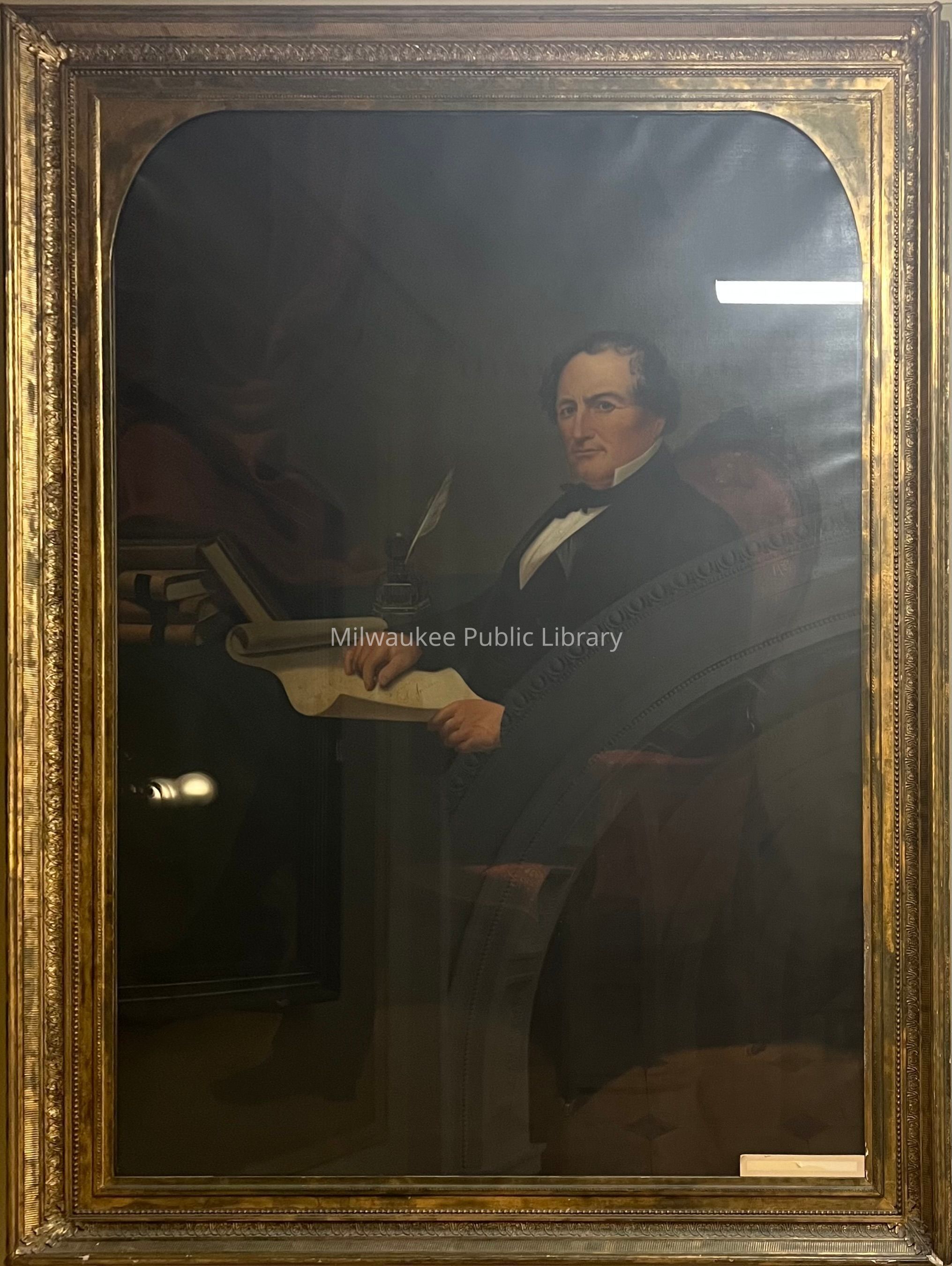 "Brookes's excellent portrait of Solomon Juneau, founder of Milwaukee and first Mayor of the city, which now graces the walls of the Bank of Commerce as a relic of the Juneau Bank, will be transferred to the new City Hall under the resolution concurred in by the Board of Aldermen during last evening's session" (source: 9/19/1871 Milwaukee Daily Sentinel).