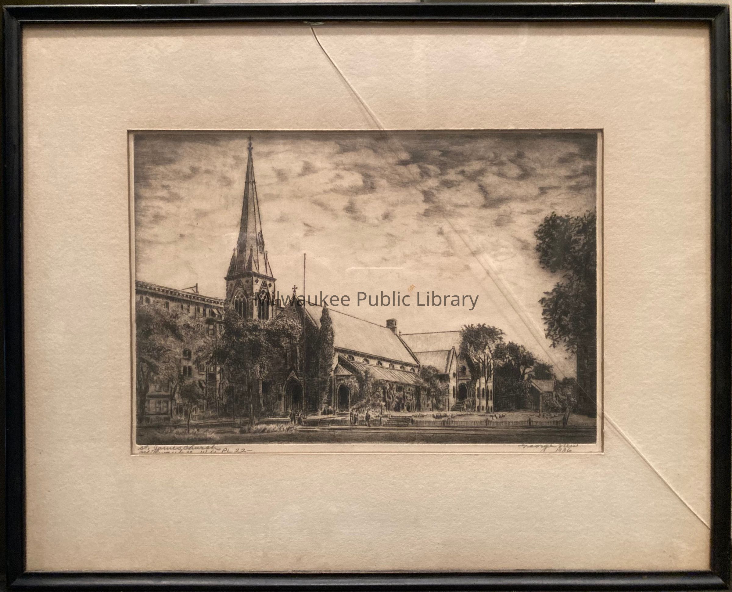 The 12/18/1938 MJ (attached) references an exhibition of "a complete set" of George New's "Milwaukee etchings," including the city hall, St. John's cathedral, the library-museum building, St. James' church, St. Paul's, Merrill Hall at UWM, Marquette towers, and the high altar at Gesu, at the Central Library. The etchings were shown alongside "the artist's plates and tools."