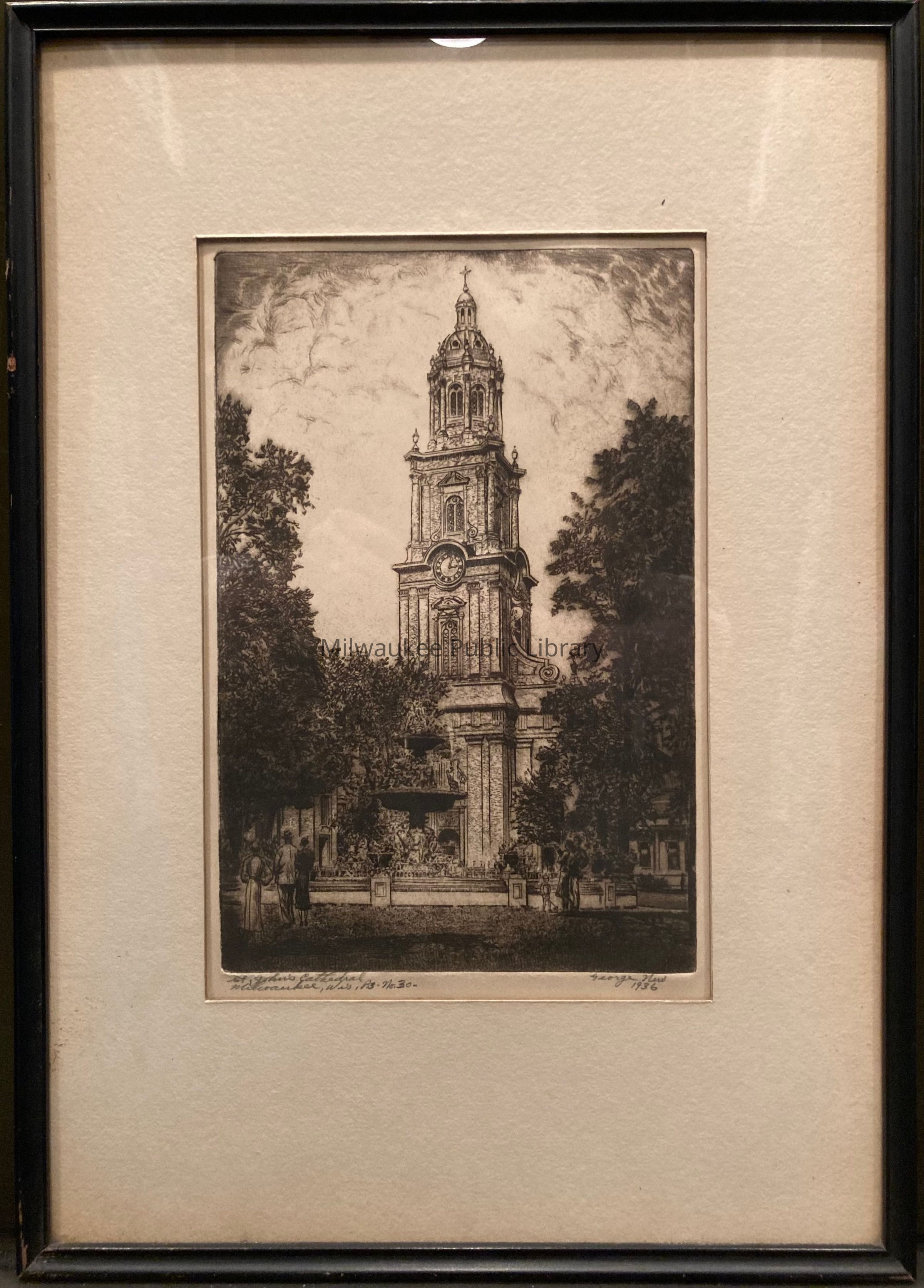 The 12/18/1938 MJ (attached) references an exhibition of "a complete set" of George New's "Milwaukee etchings," including the city hall, St. John's cathedral, the library-museum building, St. James' church, St. Paul's, Merrill Hall at UWM, Marquette towers, and the high altar at Gesu, at the Central Library. The etchings were shown alongside "the artist's plates and tools."
