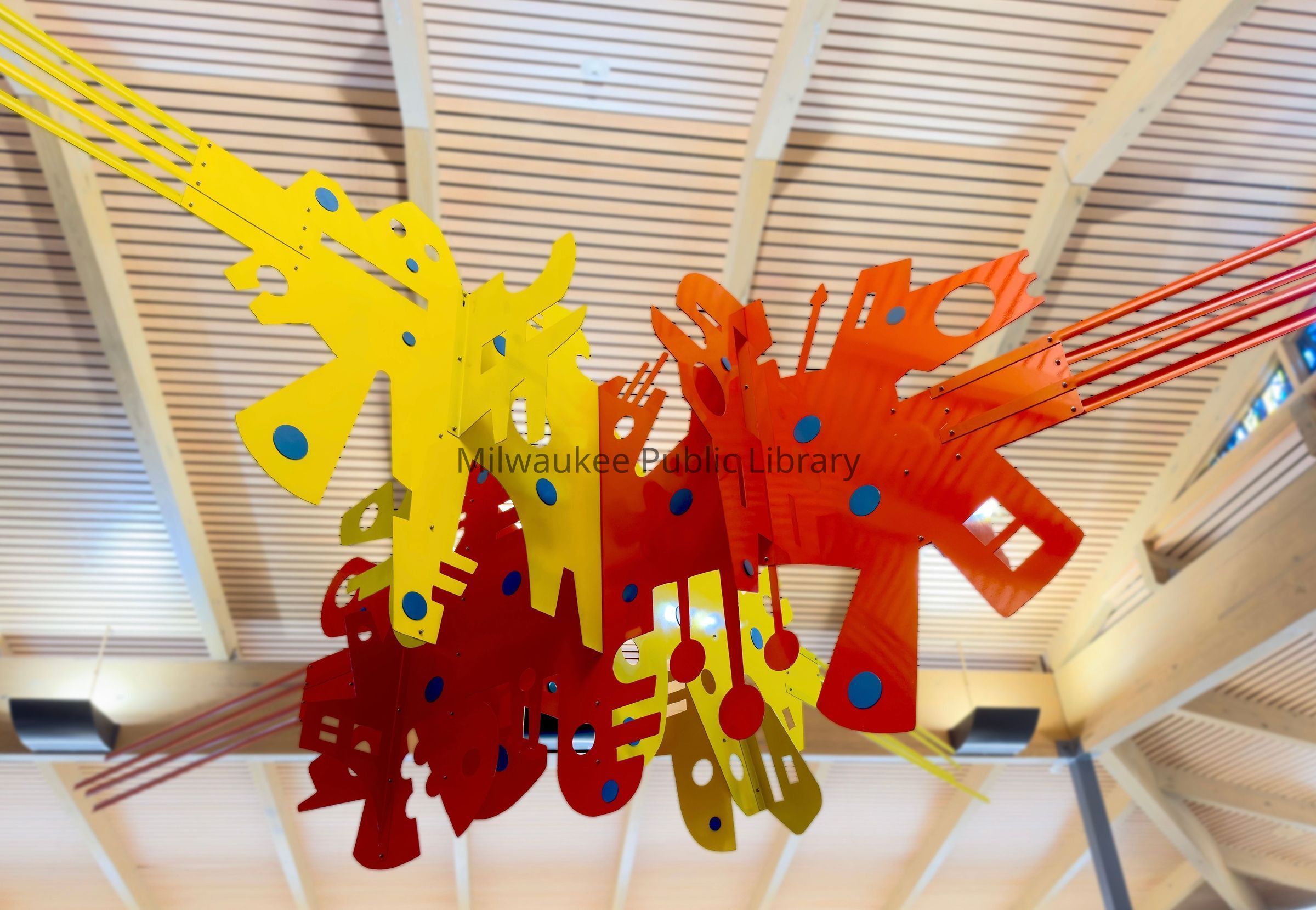 "The sculpture is the artist's conception of the ancient Indian god spirit Manitou. The artist was stimulated toward this representation by the name Tippecanoe. This hanging piece represents the modern artist's approach to creativity by using materials which represent modern industry along with a computer technique. Mr. Brink worked with a local metal fabricating concern [Super Steel Products Corp.] in computerizing his design and in using modern industrial methods to develop the structure. The artist with this sculpture has used basic color which, although bright, allows the viewer to relate more easily with the overall form."