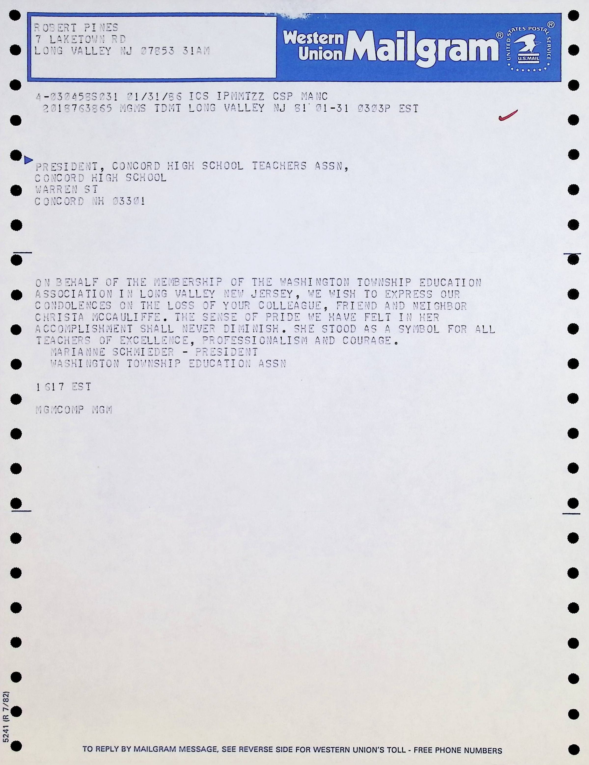 Mailgram dated January 31, 1986Entry/Object ID
