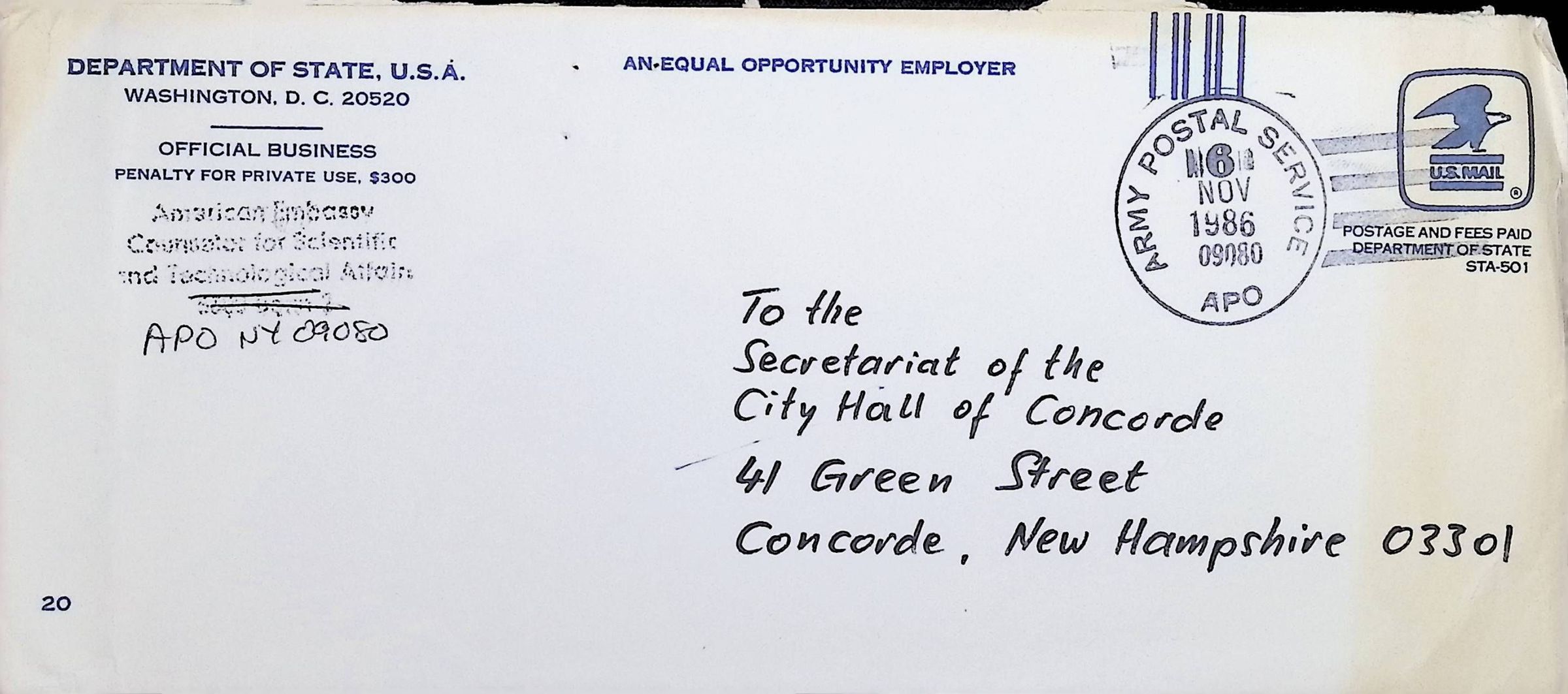 Typed letter to Secretary of Concord City Hall from Dieter (last name indecipherable) from the Science Office in the American Embassy Bonn