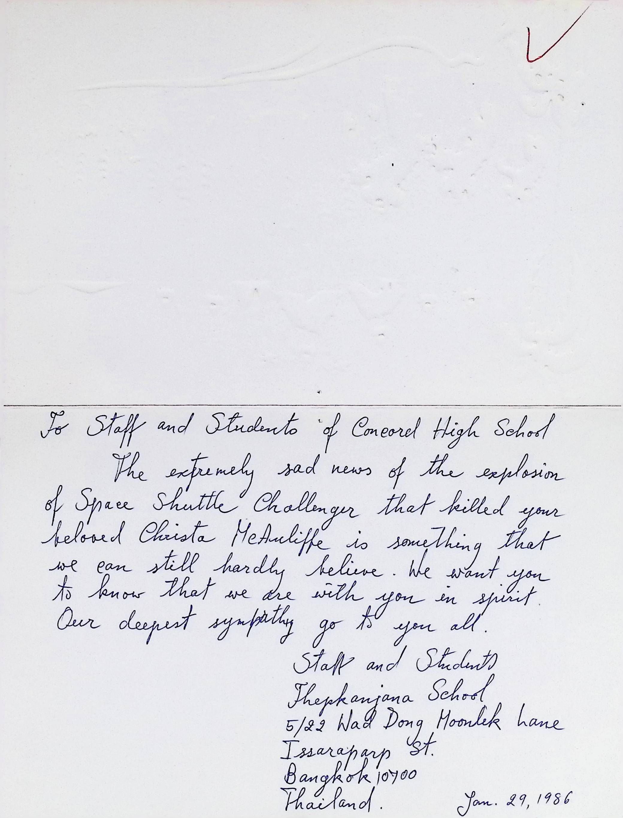 Sympathy Card Addressed to the Staff and Students of Concord High School from Thepkanjana School Staff and Students Dated January 29, 1986