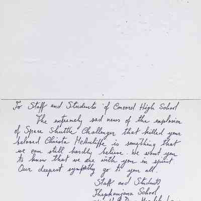 Sympathy Card Addressed to the Staff and Students of Concord High School from Thepkanjana School Staff and Students Dated January 29, 1986