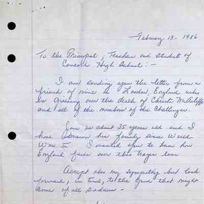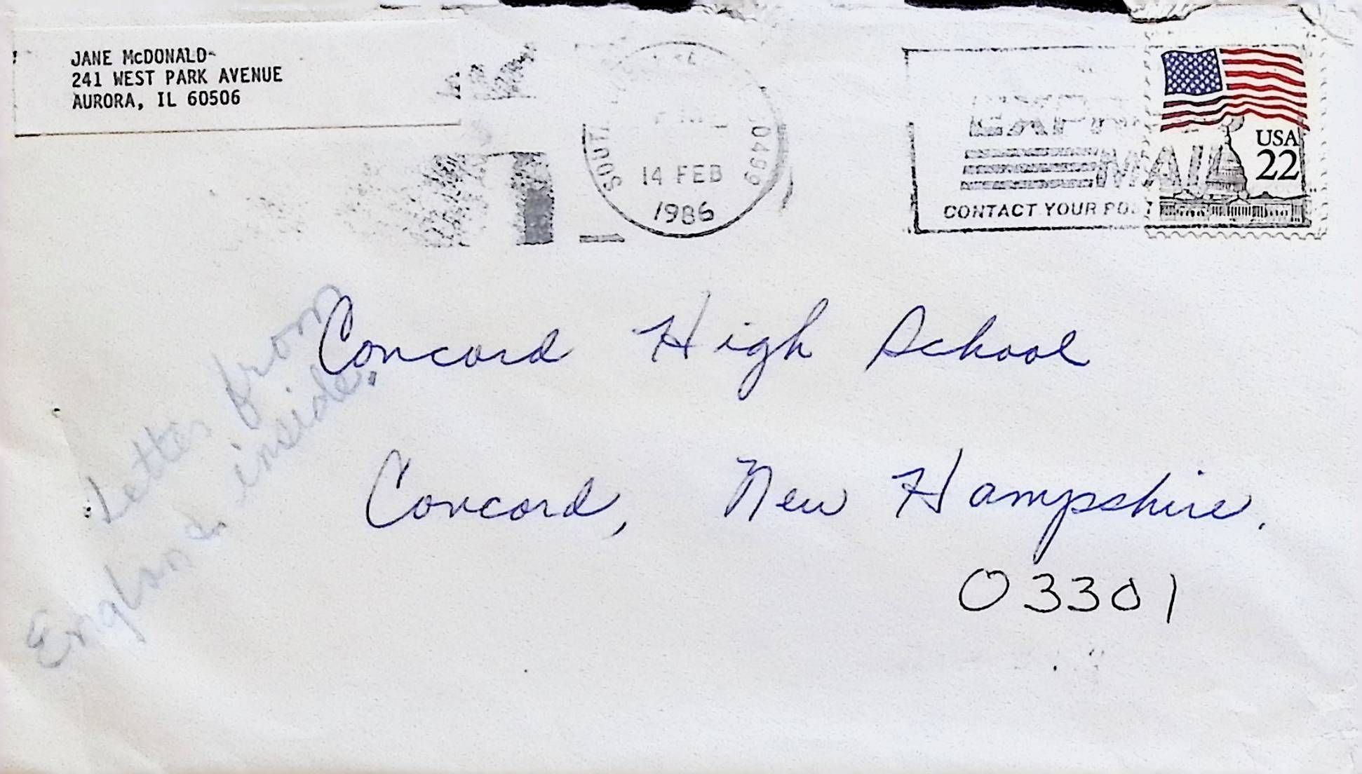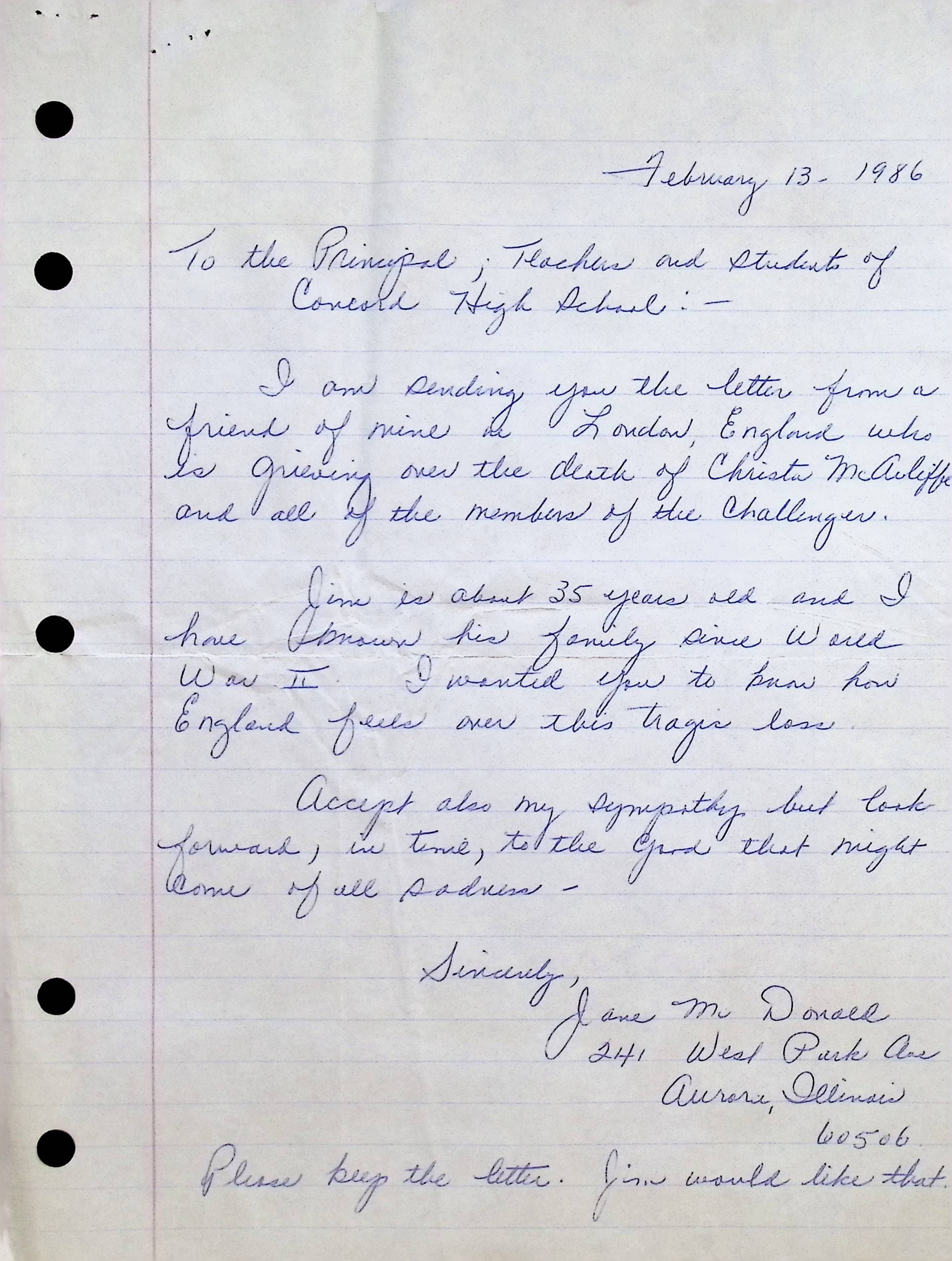 Handwritten Letter to Principal, Teachers, and Students of Concord High School from Jane McDonald