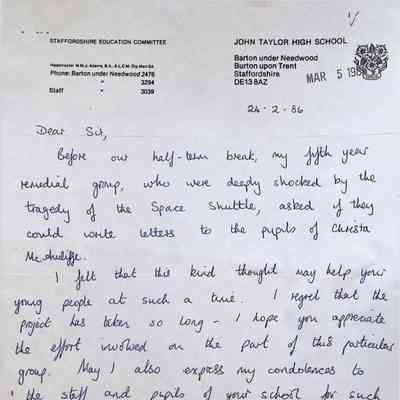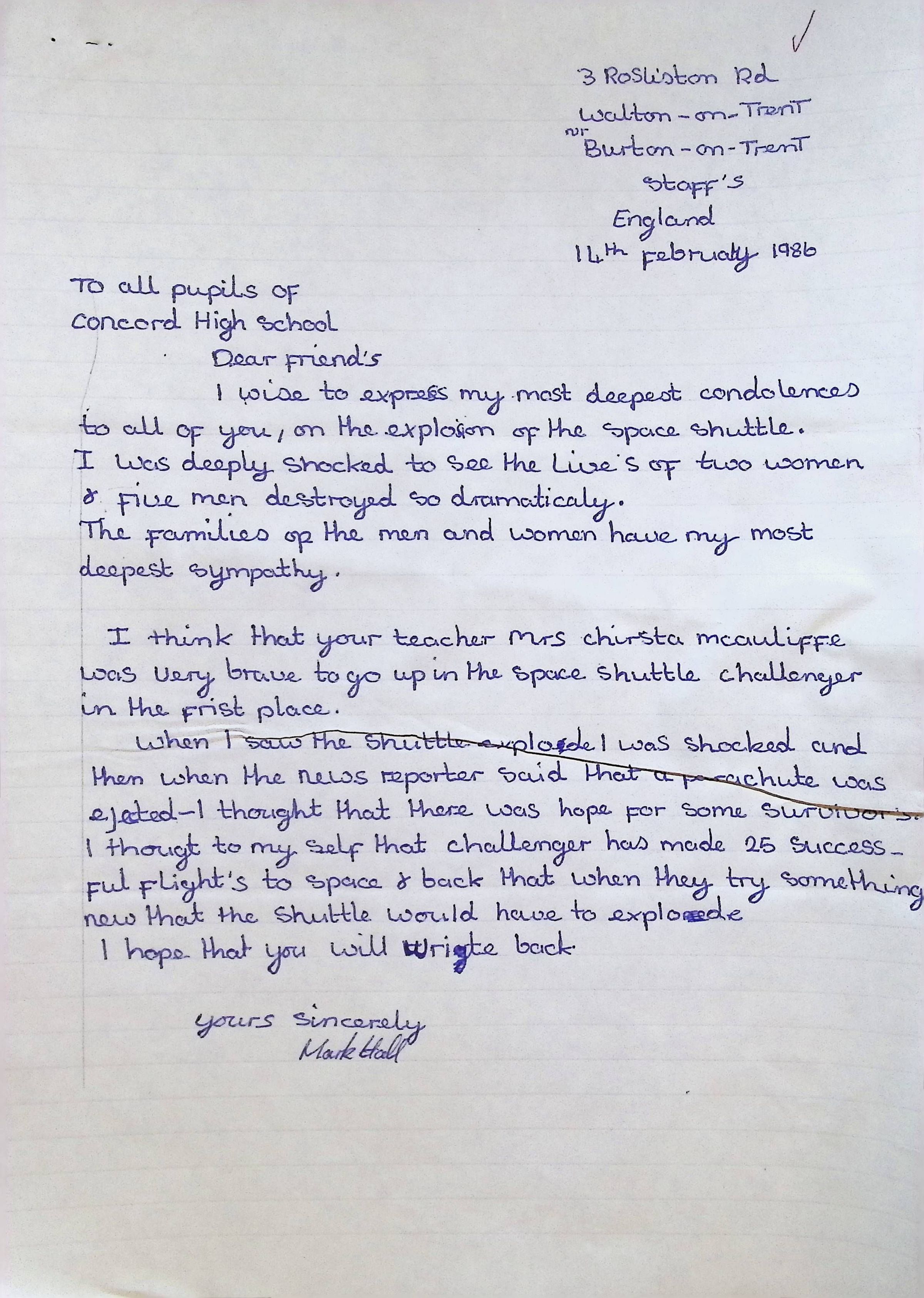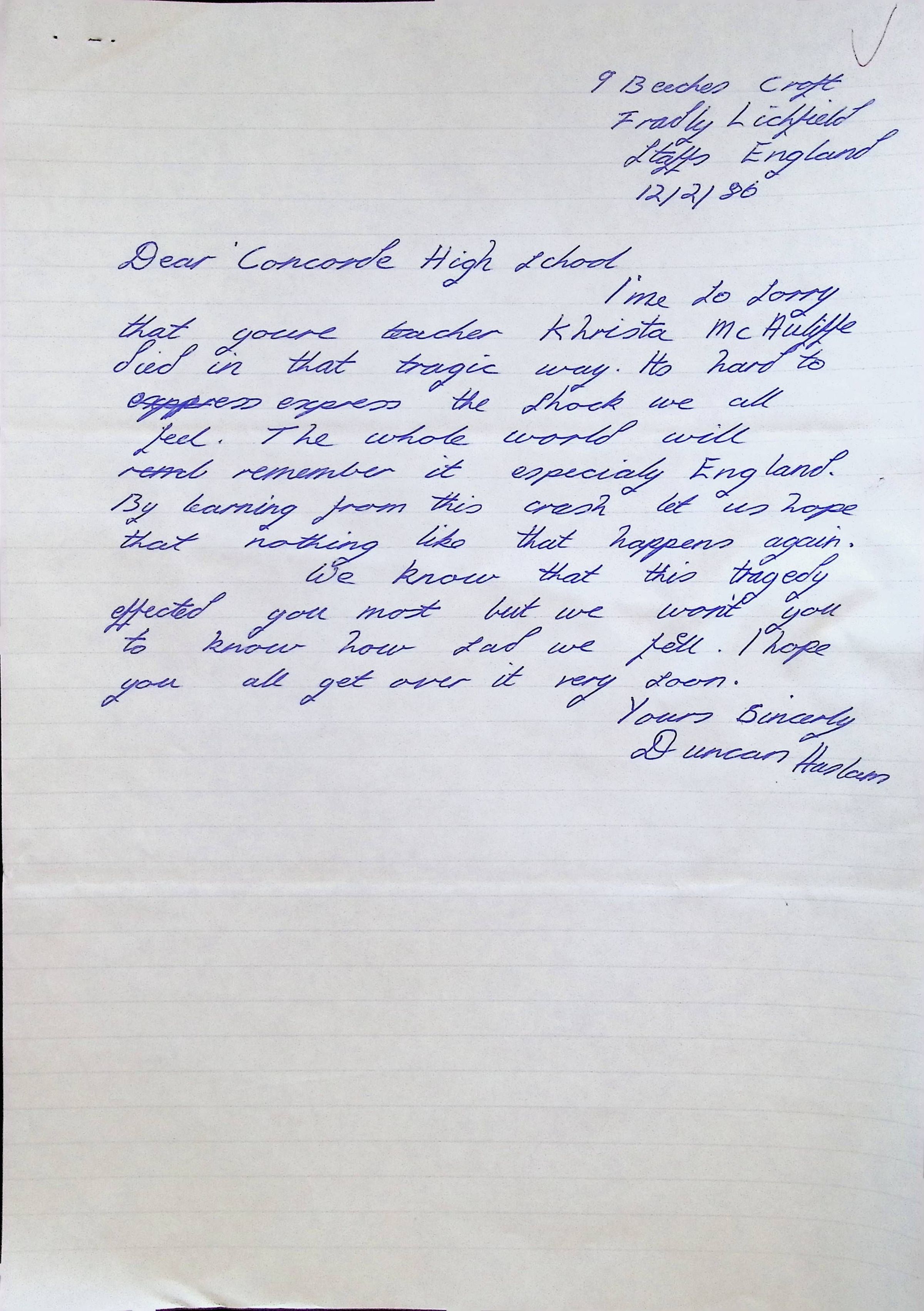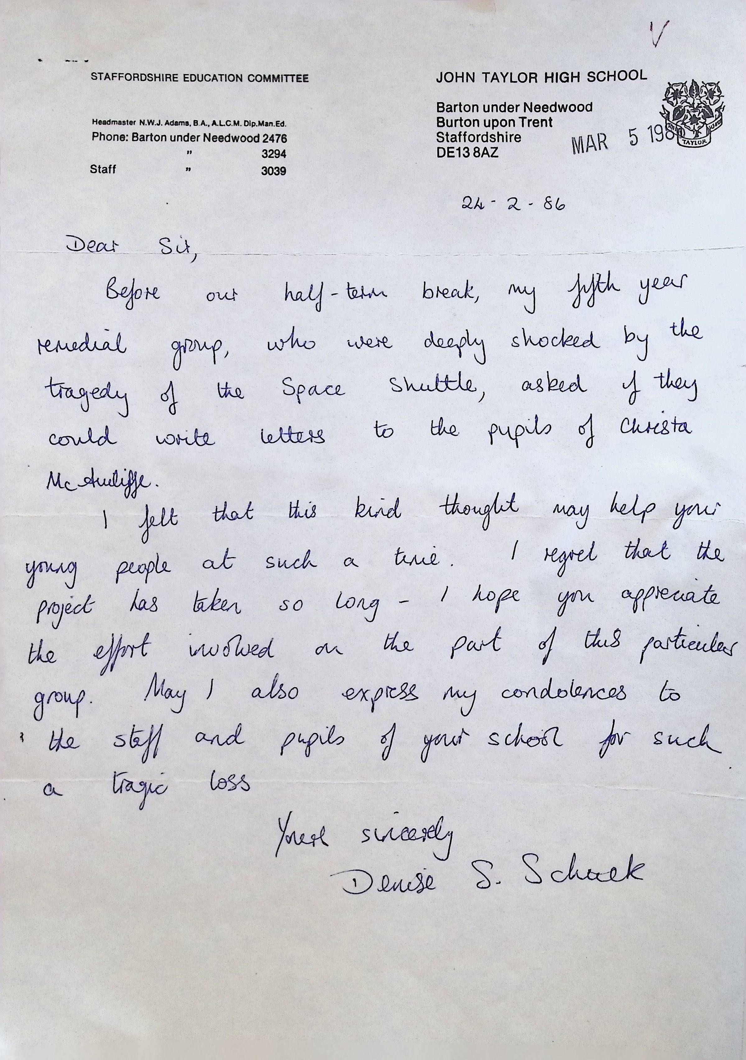 Handwritten Letter to Charles Foley (Principal of Concord High School) from Denise S. Schuek from John Taylor High School